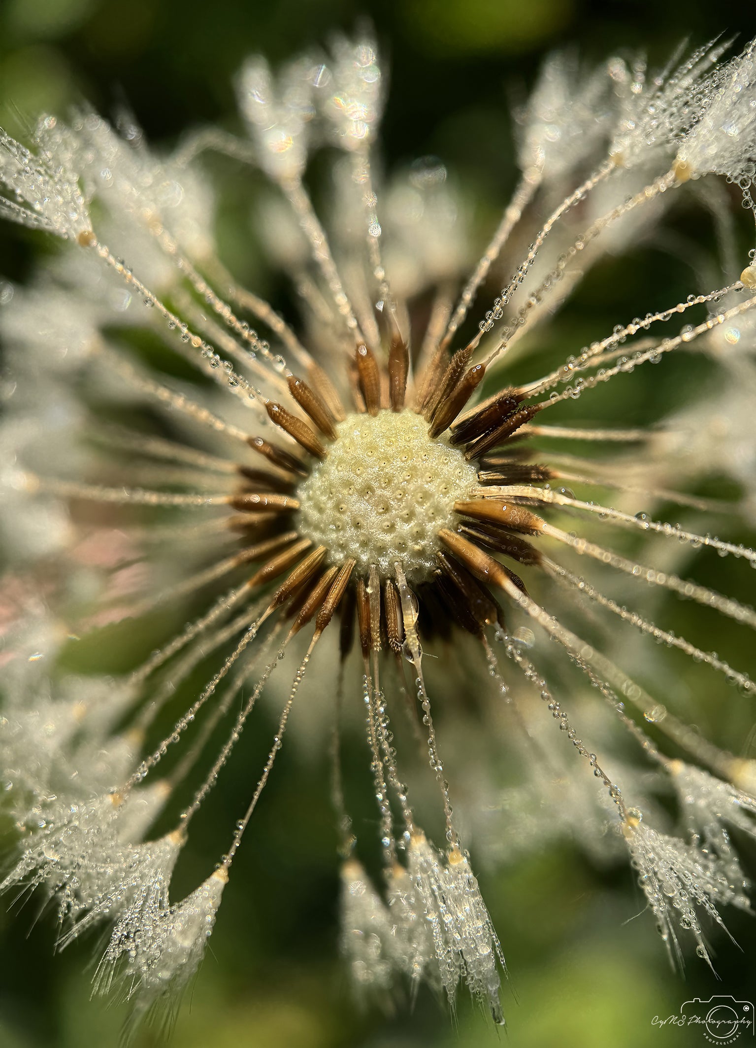 Viele winzige Tautropfen haften zart an den feinen Staubfäden eines Löwenzahns, eingefangen in einem wunderschönen Makro, das eine Welt verborgener Eleganz offenbart. Jeder Tropfen schimmert wie ein Kristall und reflektiert das Licht mit stiller Brillanz. Die komplexe Struktur des Löwenzahns hält sie wie eine Krone aus Morgenjuwelen.