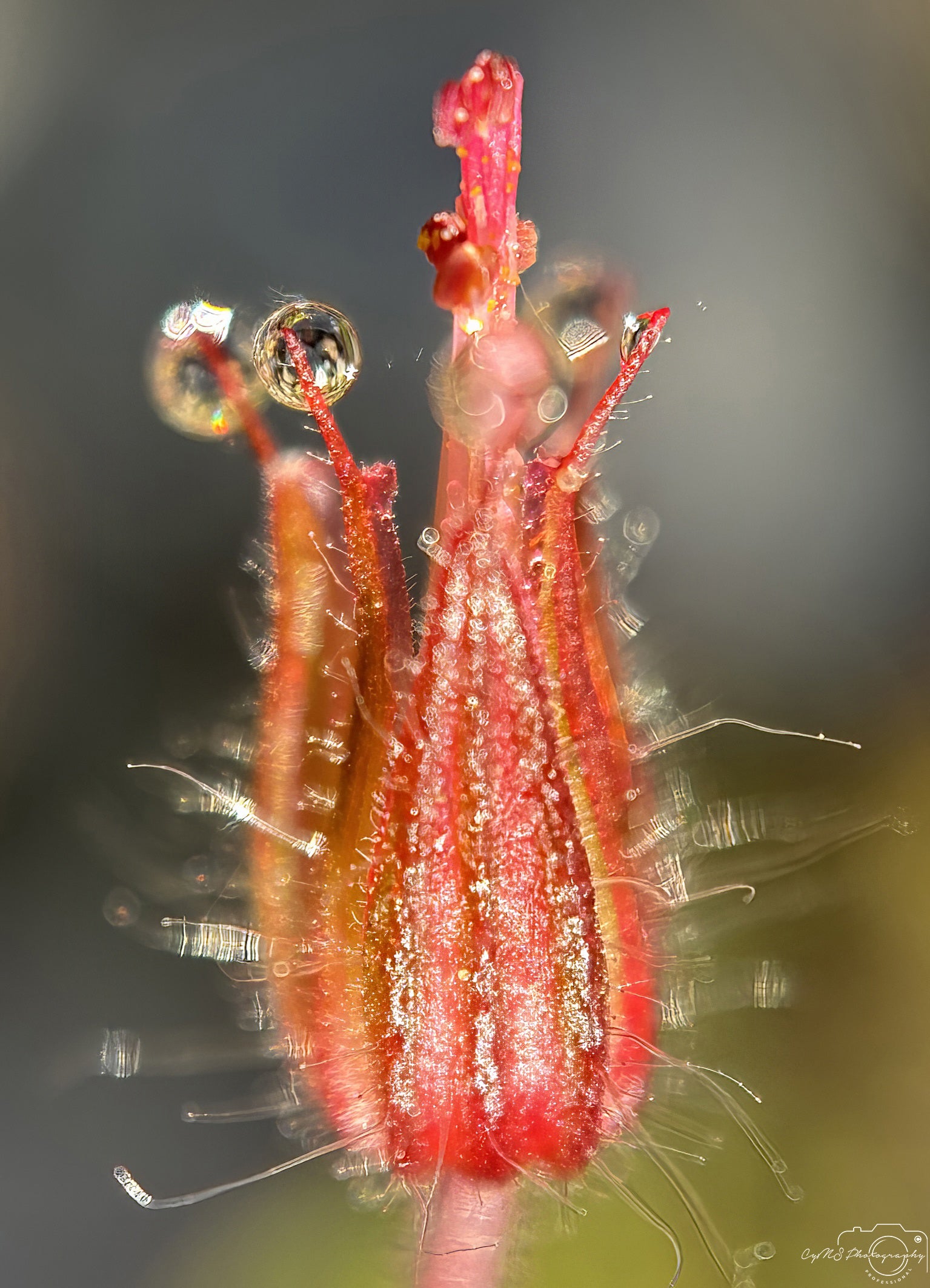 Die Blüte des Geranium robertianum bleibt geschlossen, ihr leuchtend roter Körper ist unter den gekräuselten Blütenblättern sichtbar. Tautropfen, nun zu perfekten Kugeln geformt, ruhen zart an den äußeren Rändern der Blüte, an ihren Enden. Diese winzigen, kugelförmigen Perlen fangen das Licht ein und verleihen dem leuchtenden Rot der geschlossenen Blüte ein subtiles Funkeln. Die Tropfen haften sanft, als ob die Natur die Blüte in ihrer stillen Morgenstille beschützen würde.