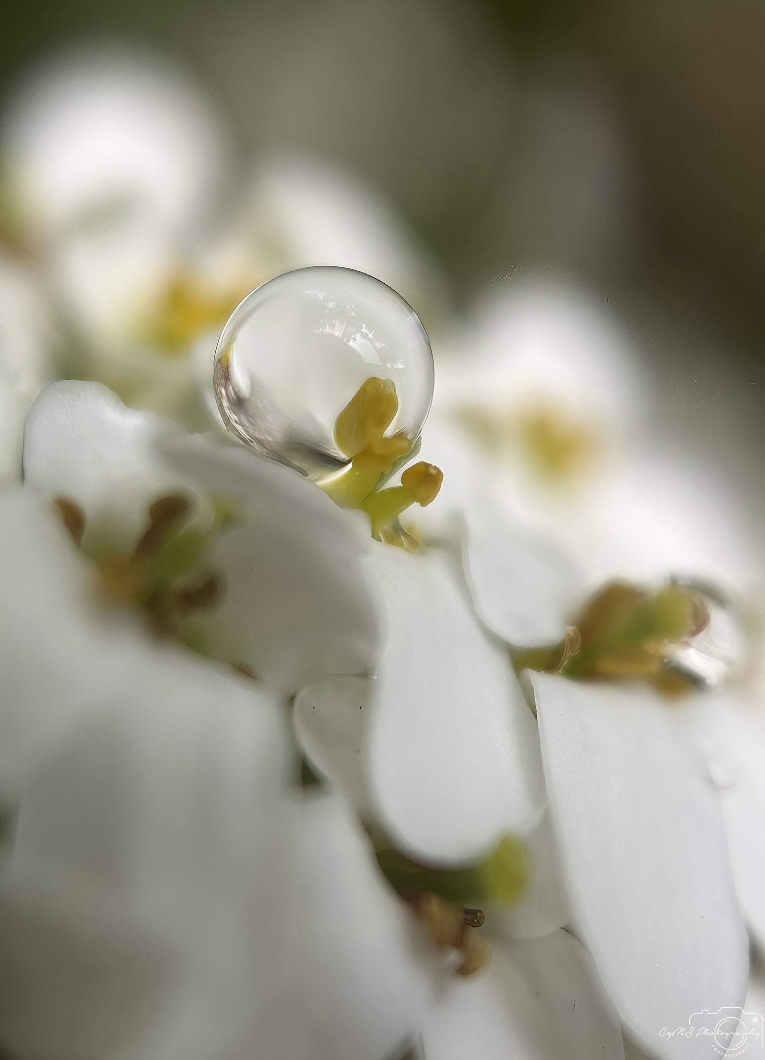 Ein einzelner, glitzernder Wassertropfen ruht zart auf dem schneeweißen Blütenblatt einer Iberis sempervirens , dessen Oberfläche wie eine polierte weiße Perle schimmert. Nach einer durchnässten Nacht verstärkt der Tropfen die seidige Textur des darunterliegenden Blütenblattes. Um ihn herum entfalten sich anmutig Büschel reinweißer Blütenblätter, unterbrochen von winzigen gelben Stempeln, die der ansonsten makellosen Szenerie eine sanfte Wärme verleihen. Der Gesamteindruck ist heiter und elegant – ein minimalistisches Meisterwerk der Natur.