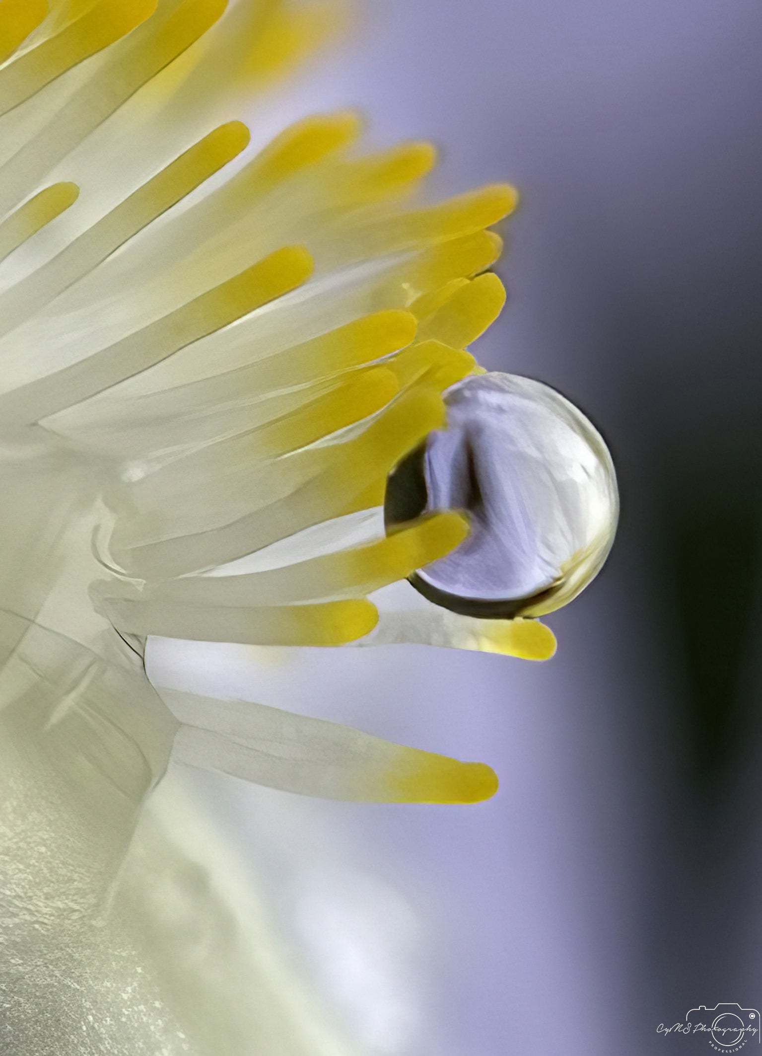 Auf einer Iris pallida , eingebettet zwischen ihren eleganten Blütenstempeln, liegt ein prächtiger, durchscheinender Wassertropfen. Er reflektiert eine Mischung prächtiger Farben – Gelb, Hellviolett und Weiß – und fängt die zarten Farbtöne der Blüte in seiner klaren, schimmernden Oberfläche ein. Im Inneren des Tropfens bildet die Spiegelung eine verspielte Form, fast wie ein Smiley oder Emoji – als würde die Natur dem Betrachter mit stiller Freude zuzwinkern.