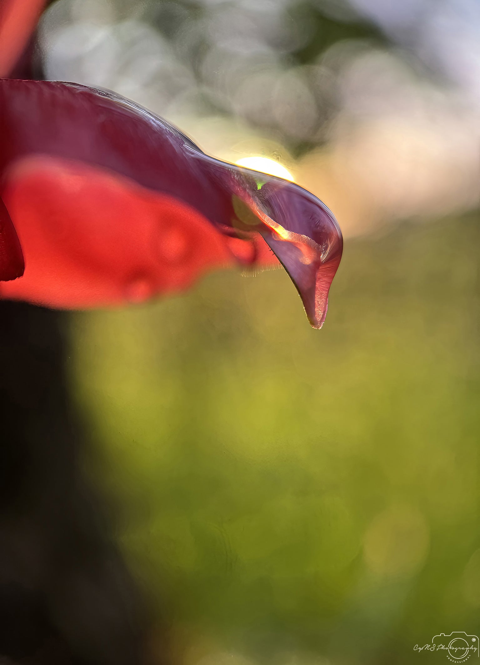 Auf einer Tulipa agenensis ruht ein wunderschöner Wassertropfen sanft auf einem ihrer leuchtenden Blütenblätter. Seine Form und Spiegelung erwecken die Illusion eines Vogels aus einem Comic. Die Farben im Tropfen – wirbelnde Rot-, Orange- und Gelbtöne – bilden die zarte Silhouette des Vogels, als wäre der Tropfen selbst ein winziges, wunderliches Wesen, das bereit ist, aus dem Herzen der Blüte zu fliegen.