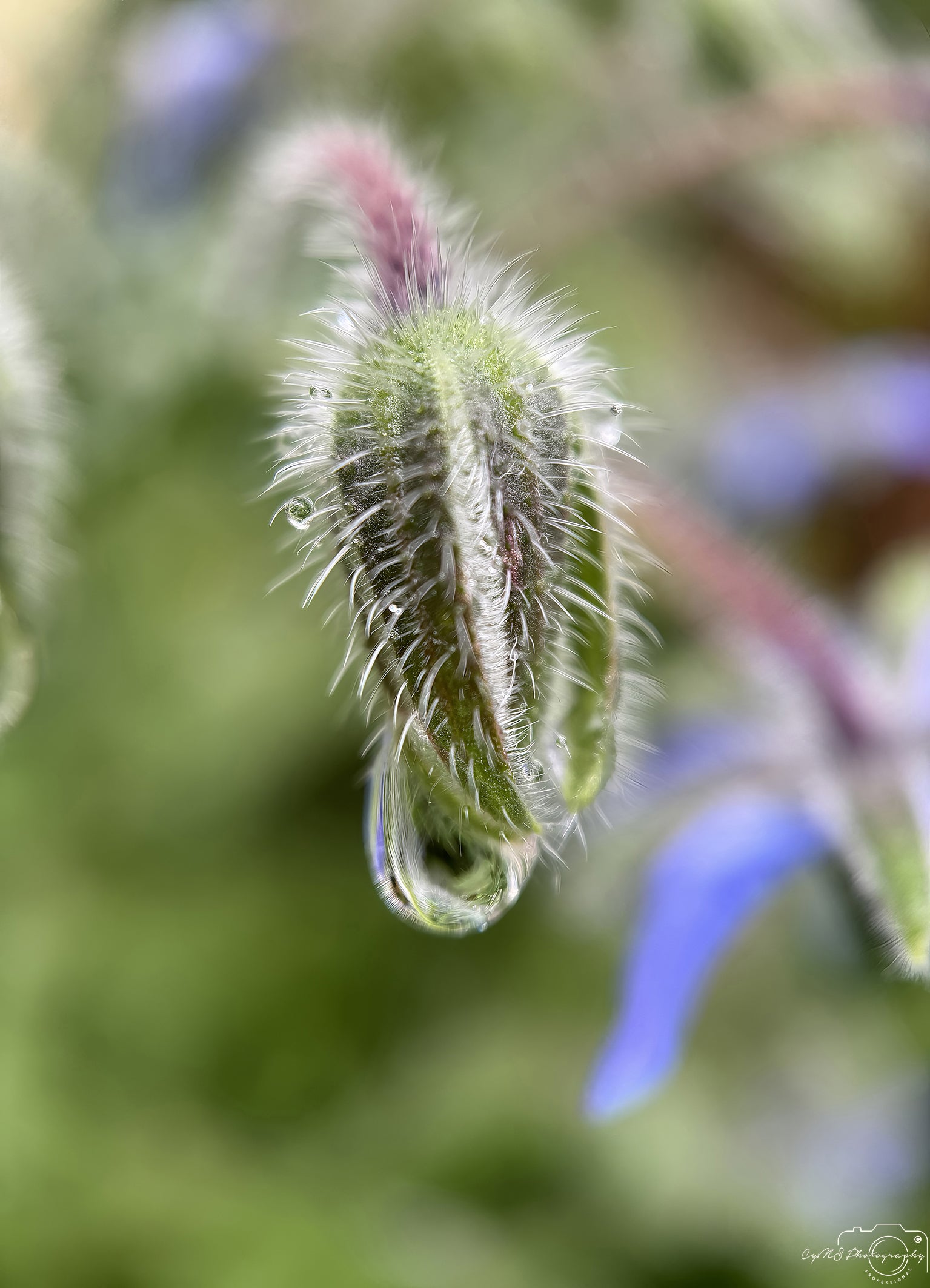 Auf der sternförmigen Blüte eines Borago officinalis ruht friedlich ein wunderschöner Wassertropfen, dessen glatte Oberfläche das tiefe Blau der darunterliegenden Blütenblätter widerspiegelt. In vollkommener Stille balanciert, scheint er fast in die Blüte selbst eingewoben zu sein, wie ein Juwel, das die Natur mit stiller Absicht dort platziert hat.