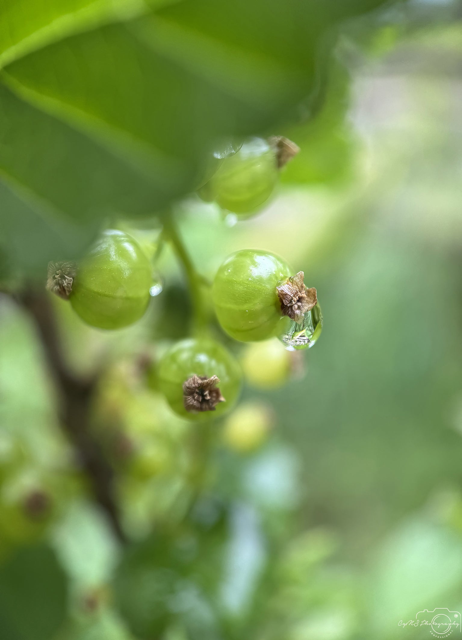 Auf einer leuchtend grünen Ribes rubrum -Frucht ruht ein einzelner, wohlgeformter Wassertropfen, als hätte er in einer Nacht mit starkem Regen den perfekten Parkplatz gefunden. Er haftet mühelos an der glatten Oberfläche und bewahrt die Erinnerung an den Sturm in seinem ruhigen Glanz. Der Kontrast zwischen der Klarheit des Tropfens und dem leuchtenden Grün der Frucht verleiht dem Moment Frische und Zeitlosigkeit.