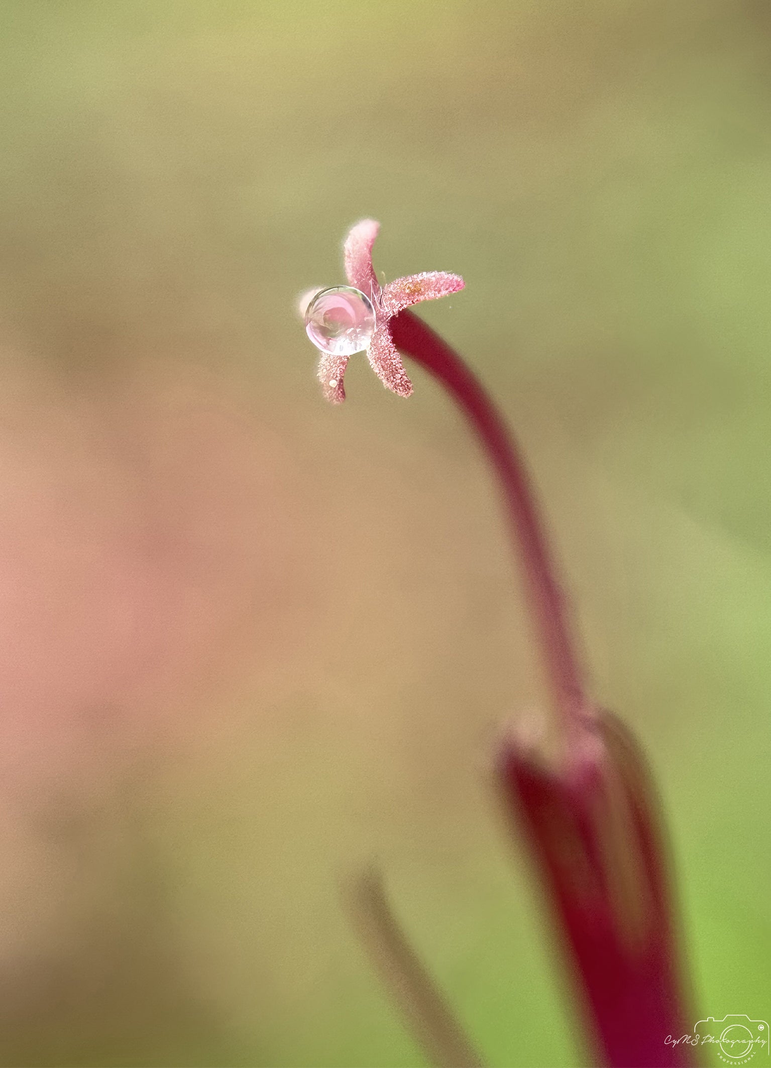 An der Spitze eines langen Stiels, genau in der Mitte der Blüte des Geranium macrorrhizum, sitzt ein wunderschöner, frischer und klarer Wassertropfen. Die Blüte mit ihrer zarten Mischung aus rötlichen, rosa und weißen Blütenblättern hebt sich deutlich ab, während alles andere um sie herum verblasst oder verschwommen erscheint. Dieser einzelne Tropfen fängt das Licht perfekt ein, wie ein zartes Juwel, umhüllt von der Natur. Nur die Blüte und der Wassertropfen behalten ihre volle Farbe und Klarheit und ziehen den Blick auf diesen stillen, aber eindrucksvollen Moment.