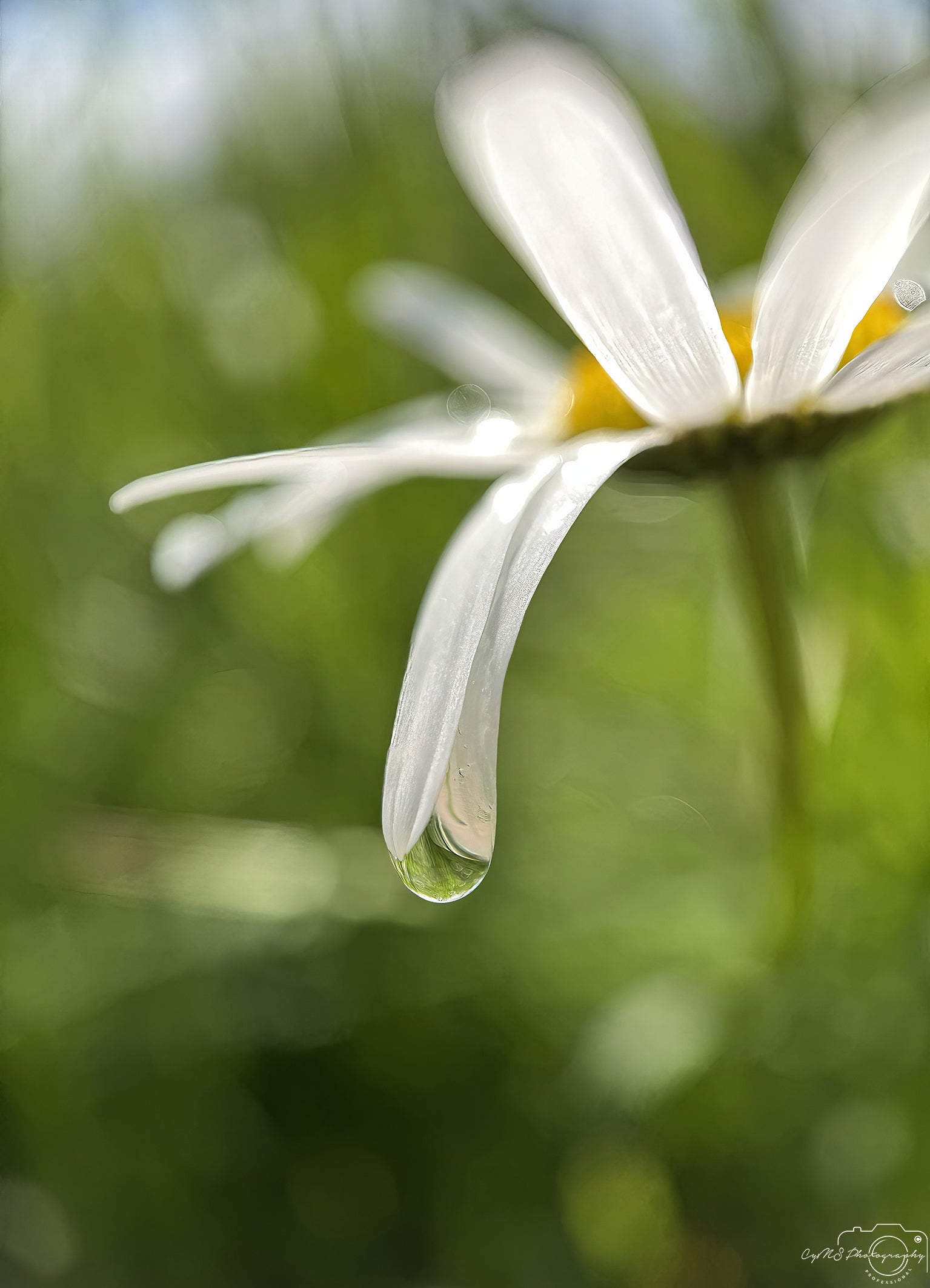 Zwischen zwei strahlend weißen Blütenblättern der Leucanthemum vulgare schmiegt sich ein kristallklarer Tropfen sanft und in perfekter Balance. In seiner geschwungenen Oberfläche schimmert das Spiegelbild des schlanken grünen Grases mit atemberaubender Klarheit und Tiefe. Der Kontrast zwischen dem schneeweißen Glanz der Blume und der lebendigen smaragdgrünen Welt im Tropfen wirkt fast surreal. In diesem stillen Moment offenbart die Natur ihre zarte Kunstfertigkeit und erschafft Wunder aus den einfachsten Details.