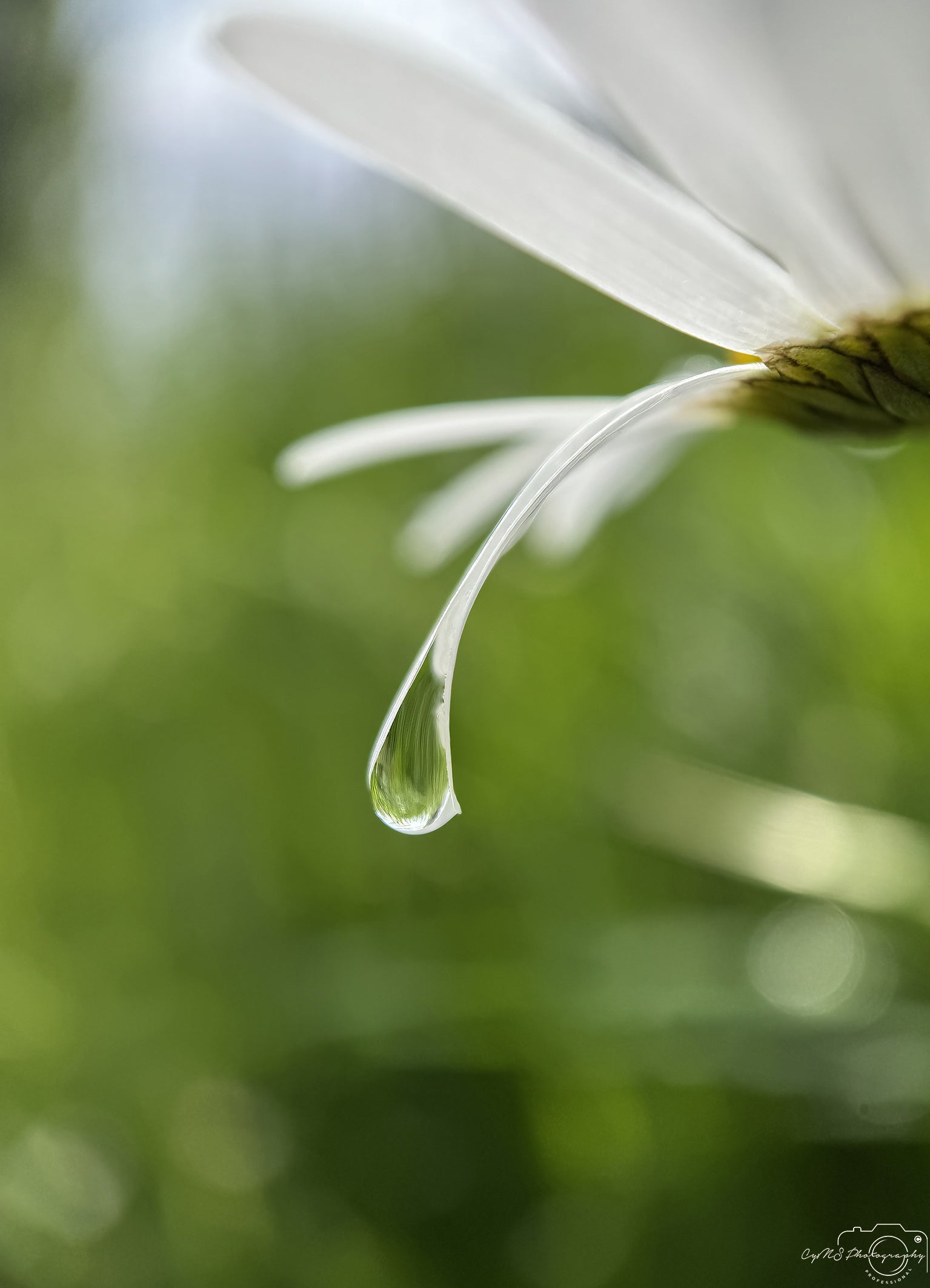 Zwischen zwei strahlend weißen Blütenblättern der Leucanthemum vulgare schmiegt sich ein kristallklarer Tropfen sanft und in perfekter Balance. In seiner geschwungenen Oberfläche schimmert das Spiegelbild des schlanken grünen Grases mit atemberaubender Klarheit und Tiefe. Der Kontrast zwischen dem schneeweißen Glanz der Blume und der lebendigen smaragdgrünen Welt im Tropfen wirkt fast surreal. In diesem stillen Moment offenbart die Natur ihre zarte Kunstfertigkeit und erschafft Wunder aus den einfachsten Details.