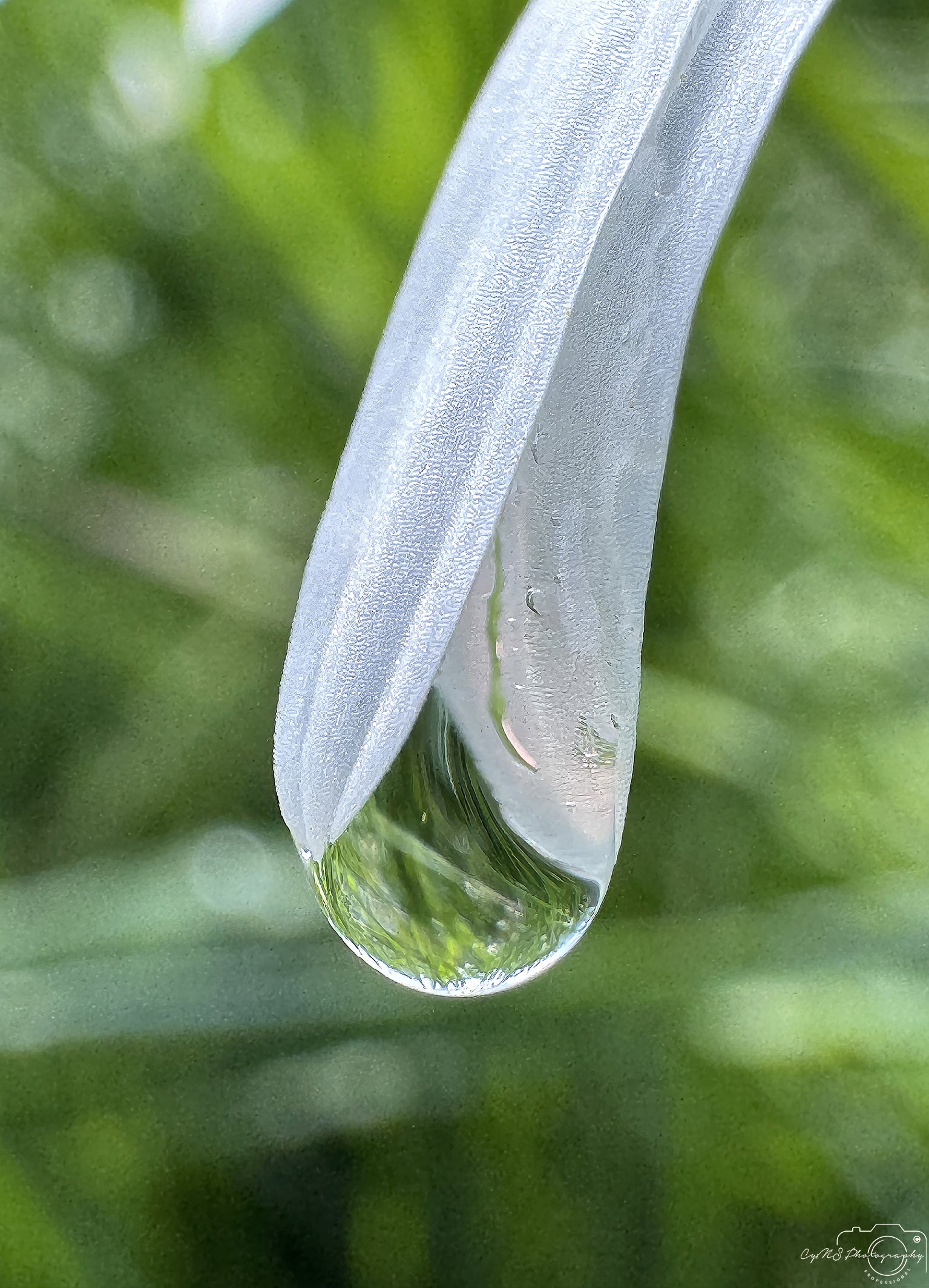 Zwischen zwei strahlend weißen Blütenblättern der Leucanthemum vulgare schmiegt sich ein kristallklarer Tropfen sanft und in perfekter Balance. In seiner geschwungenen Oberfläche schimmert das Spiegelbild des schlanken grünen Grases mit atemberaubender Klarheit und Tiefe. Der Kontrast zwischen dem schneeweißen Glanz der Blume und der lebendigen smaragdgrünen Welt im Tropfen wirkt fast surreal. In diesem stillen Moment offenbart die Natur ihre zarte Kunstfertigkeit und erschafft Wunder aus den einfachsten Details.