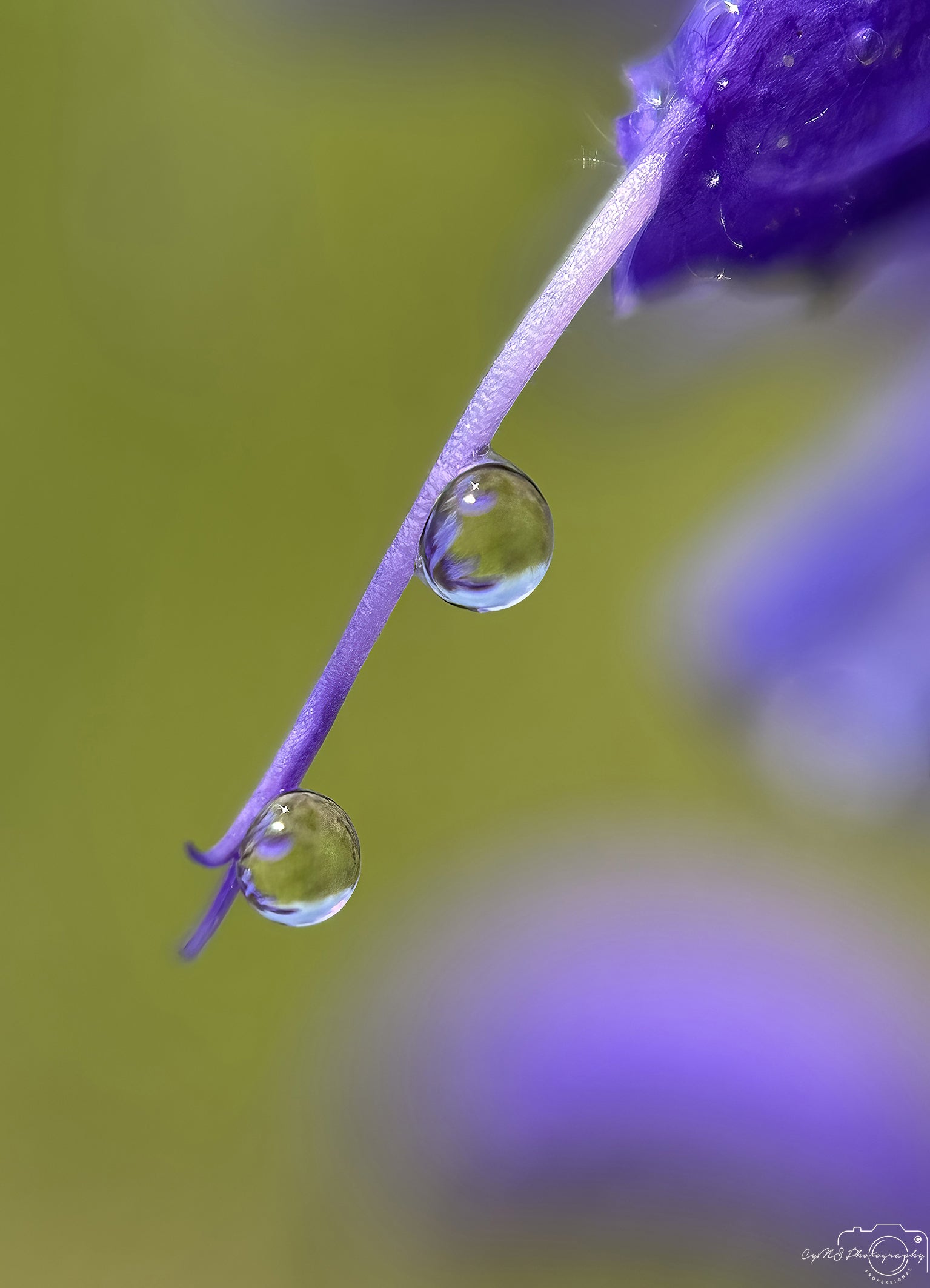 Zwei perfekt abgerundete Wassertropfen haften zart am Stempel einer Salvia pratensis und schimmern wie winzige Perlen. Ihre glatten Oberflächen reflektieren die umgebenden Violett- und Grüntöne in atemberaubender Klarheit. Mit zerbrechlicher Anmut scheinen sie der Schwerkraft zu trotzen und schweben in einem ruhigen Moment natürlicher Eleganz. Zusammen unterstreichen sie die komplexe Schönheit der Blütenstruktur, schlicht und doch zutiefst faszinierend.