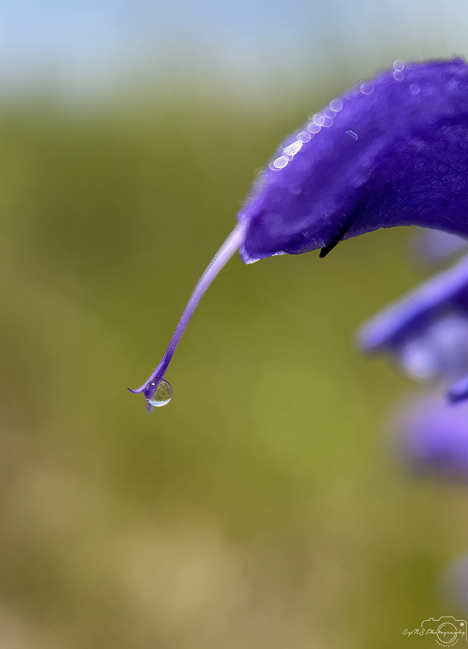 Zwei perfekt runde Wassertropfen hingen einst am Stempel einer Salvia pratensis und glitzerten wie winzige Perlen. Doch eine leichte Brise bewegte die Luft, und ein Tropfen glitt ab und fiel lautlos zu Boden. Der verbleibende Tropfen haftet nun allein und reflektiert noch immer die sanften Lila- und Grüntöne seiner Umgebung. In dieser kleinen Bewegung trifft die stille Eleganz der Blume auf den flüchtigen Rhythmus der Natur.