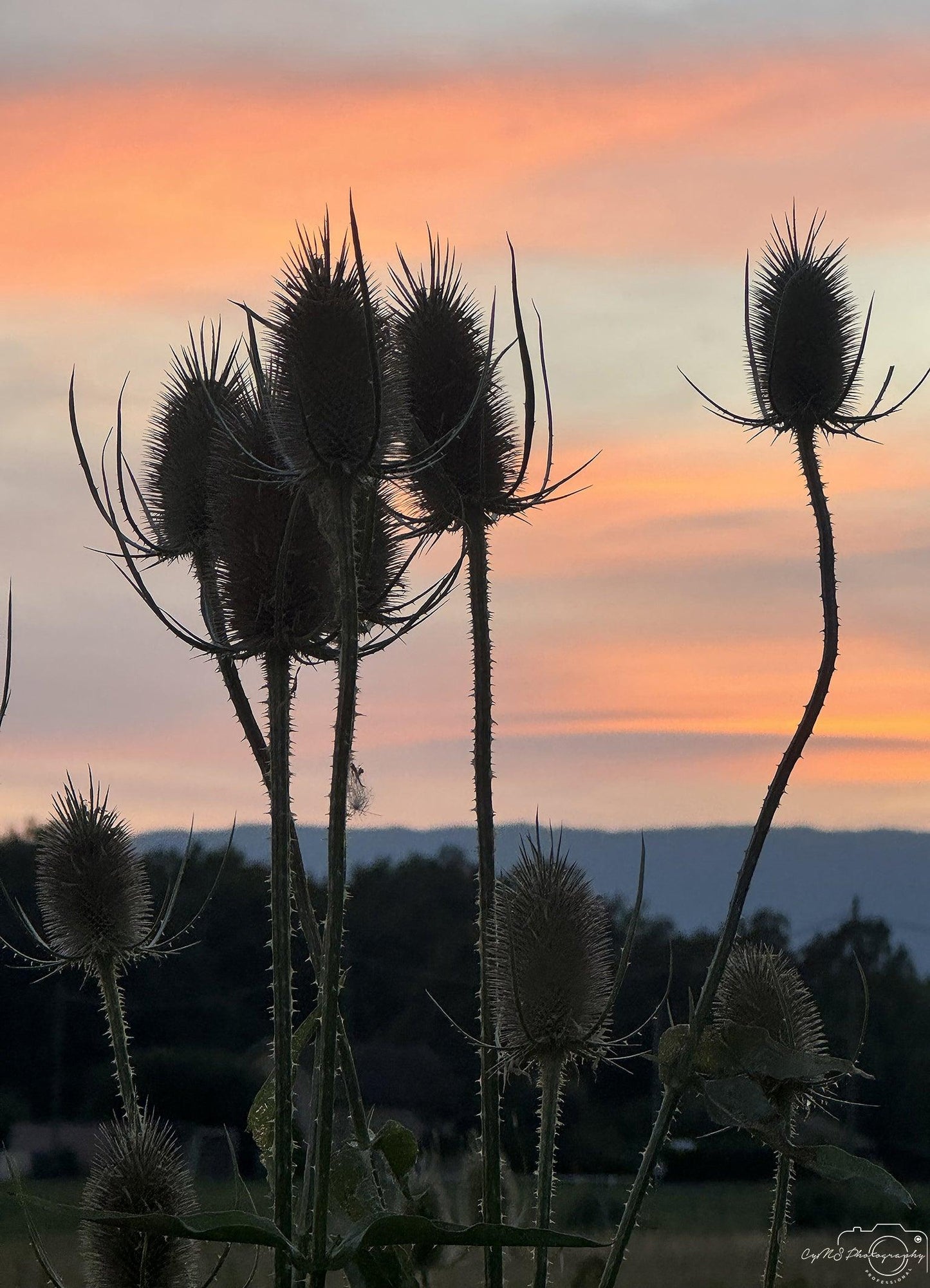 Der Himmel leuchtet in einem tiefen Orange, die Wolken wirbeln in satten, feurigen Schattierungen, die sich in einem fast surrealen Tanz über den Horizont erstrecken. Die Sonne, obwohl verborgen, strahlt ihre Wärme aus und taucht die Landschaft in einen sanften Schein. Im Vordergrund erheben sich spitze, dornenartige Blüten mit gezackten Spitzen, deren markante Formen zugleich schön und gefährlich sind. Ihre Umrisse heben sich scharf vom leuchtenden Himmel ab und verleihen der Szene einen Hauch unheimlicher Eleganz. Abseits steht die einsame Silhouette eines Baumes, dessen dunkle Äste die faszinierende Landschaft einrahmen, während die Welt im atemberaubenden Sonnenuntergang den Atem anzuhalten scheint.