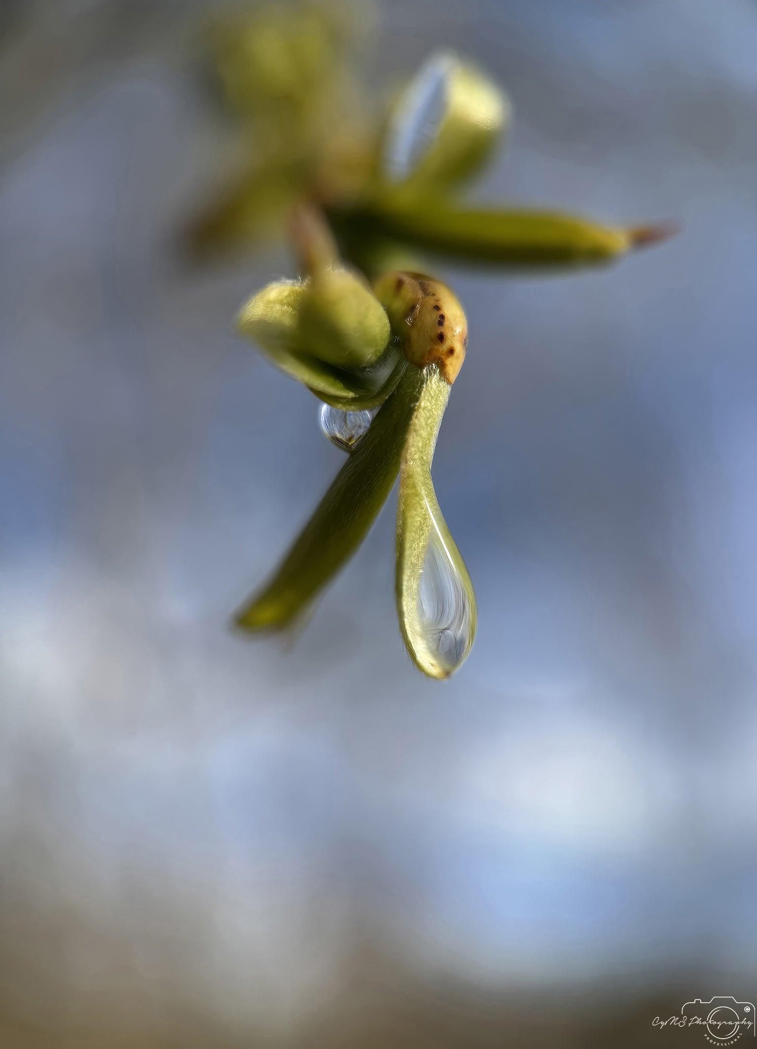 À l'extrémité d'une branche de Salix babylonica , une goutte se fond harmonieusement dans une feuille verticale, délicatement posée là où la plante dévoile ses bourgeons. La goutte capture la douce lumière du paysage, reflétant la douce promesse d'une nouvelle vie. Entourée du vert frais de la feuille, elle symbolise un moment paisible de croissance et de renouveau dans la nature.