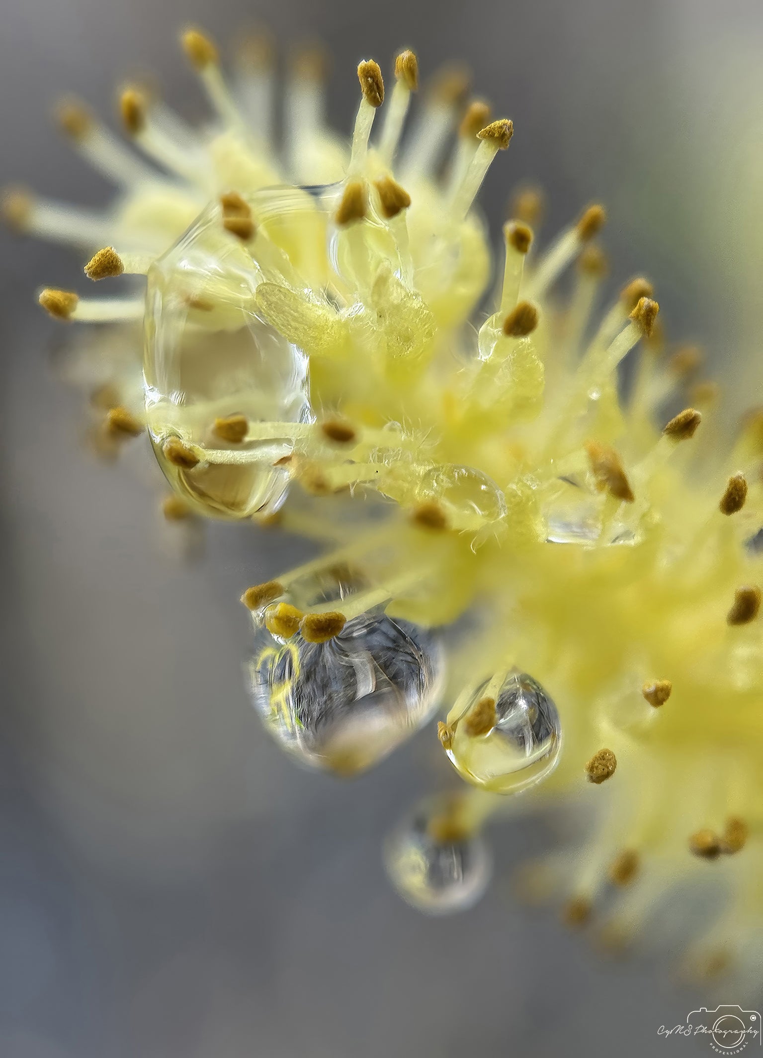 De multiples gouttes d'eau se déposent délicatement sur les pétales dorés d'une graine de saule pleureur , scintillant tels de minuscules joyaux. La lumière danse à travers leurs formes cristallines, réfractant de chaudes teintes d'ambre et de miel. Elles s'accrochent délicatement, enlaçant la texture douce de la graine, chatoyant au moindre mouvement de la brise, murmurant l'élégance tranquille de la nature avant de s'évanouir.