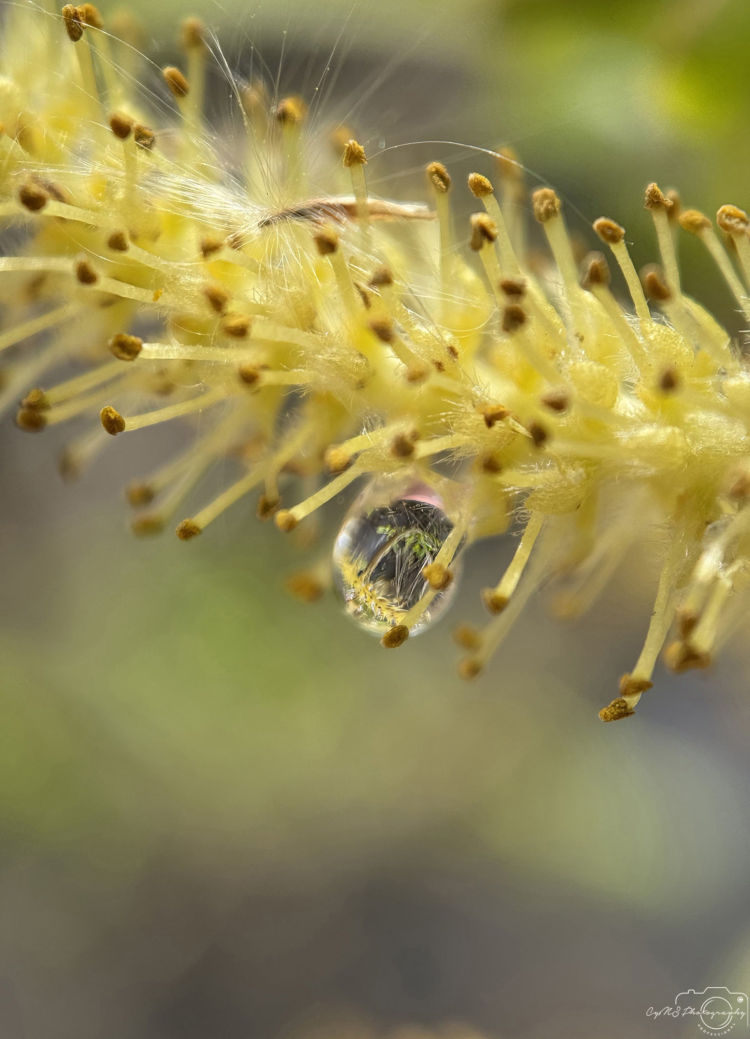 Une goutte d'eau se pose délicatement sur le pétale doré d'une graine de saule pleureur , scintillant tel un petit bijou. La lumière danse à travers sa forme cristalline, réfractant des teintes chaudes d'ambre et de miel. La goutte s'accroche délicatement, enlaçant la texture douce de la graine avant de s'envoler, emportant avec elle un murmure de l'élégance tranquille de la nature.