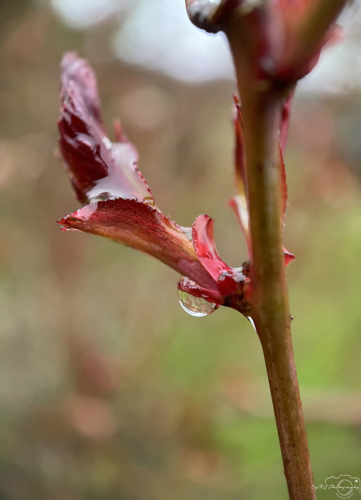 Une goutte d'eau s'accroche à l'extrémité d'un carrefour où se rejoignent les branches d'un rosier sauvage , tremblant comme un joyau suspendu. Sa forme cristalline reflète le monde en miniature, capturant les riches teintes rougeâtres des feuilles et la douceur des pétales. L'espace d'un instant, elle s'attarde, entre terre et ciel, avant de céder à la douce force de la gravité.