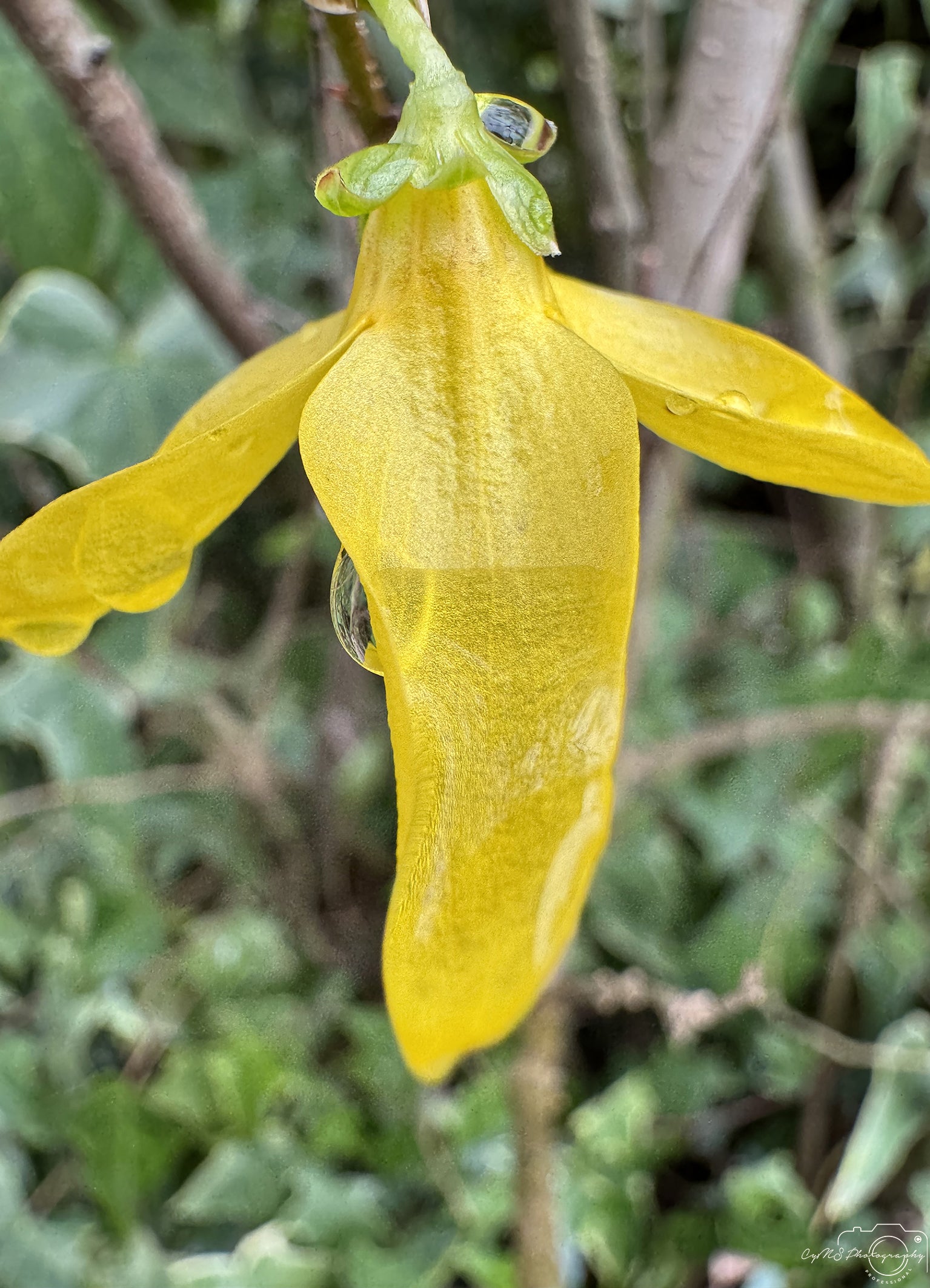 De nombreuses gouttes d'eau se déposent sur un Forsythia viridissima , chacune captant la lumière et ajoutant une touche d'éclat aux fleurs jaune vif. La couleur vive des fleurs, intensifiée par les gouttes, crée un spectacle à couper le souffle. Le contraste entre l'eau scintillante et le jaune éclatant des pétales est tout simplement saisissant, révélant la beauté de la nature en pleine floraison.