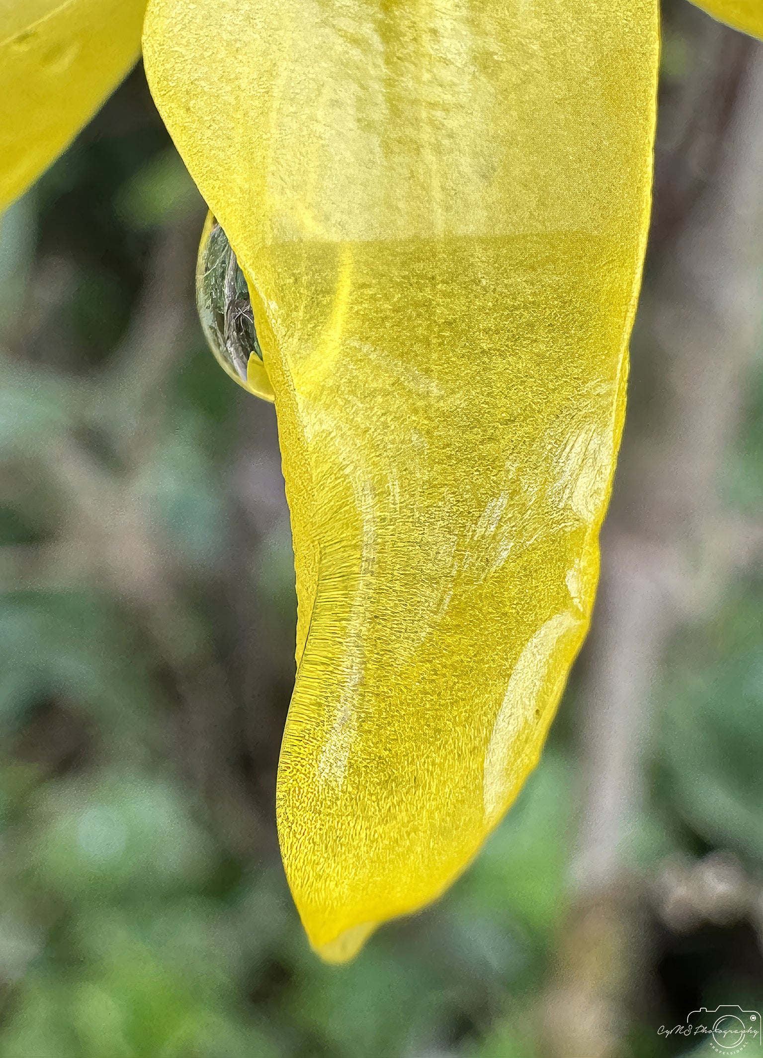 Dans ce gros plan, une goutte d'eau se pose sur la fleur d'un Forsythia viridissima , dont la surface scintillante reflète le jaune éclatant des pétales. La goutte, avec son éclat intense, ressemble à l'œil d'un crocodile prêt à bondir sur vous, ajoutant une touche de tension et d'impatience à la scène.