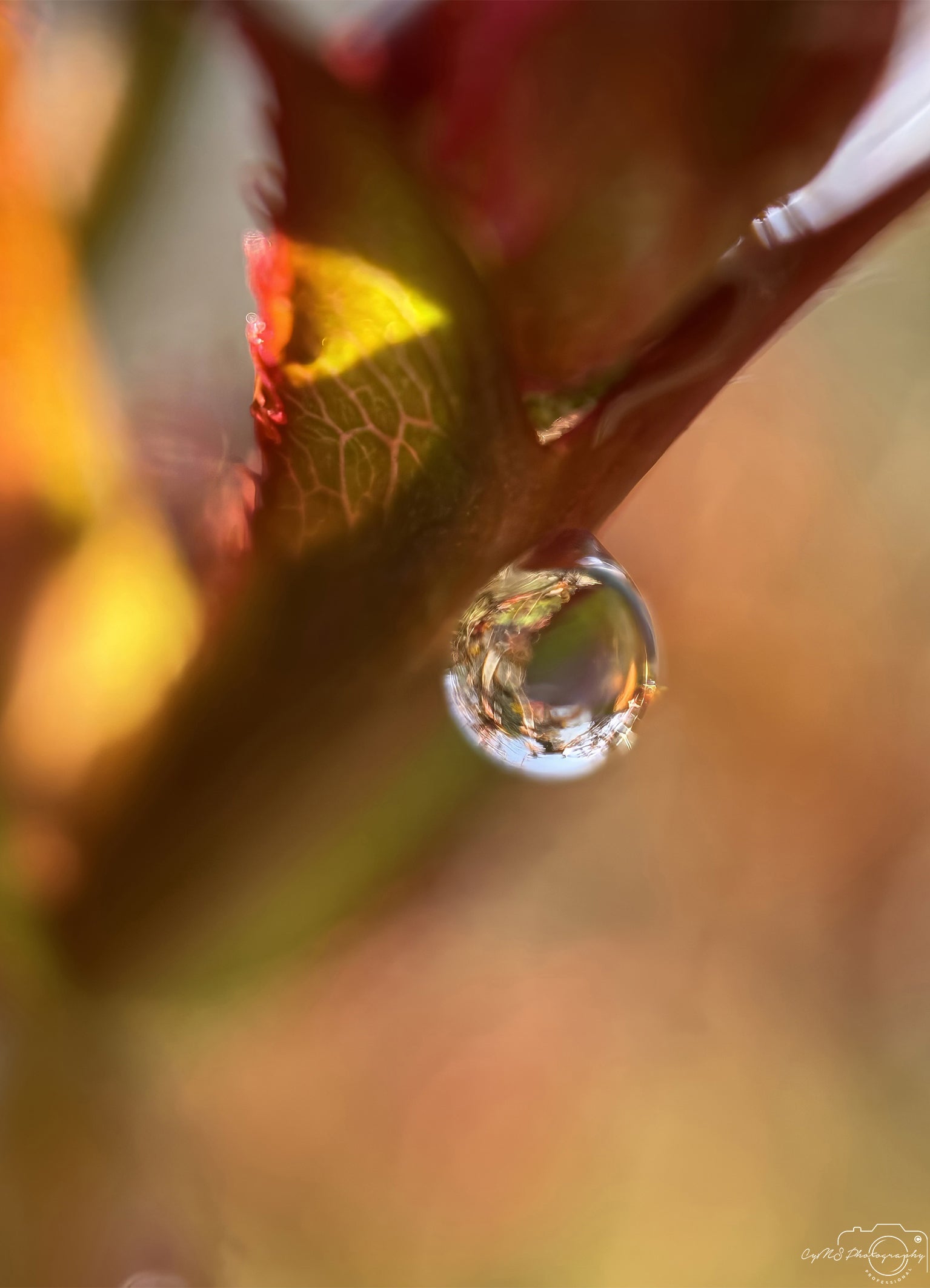 Dans ce gros plan d'une magnifique goutte d'eau, le reflet à l'intérieur révèle les couleurs vives, rougeâtre et orange foncé, d'une Rosa sempervirens . Le contraste entre les couleurs vives du reflet et la surface de la goutte crée un effet visuel saisissant et vibrant, mettant en valeur la beauté délicate de la fleur.