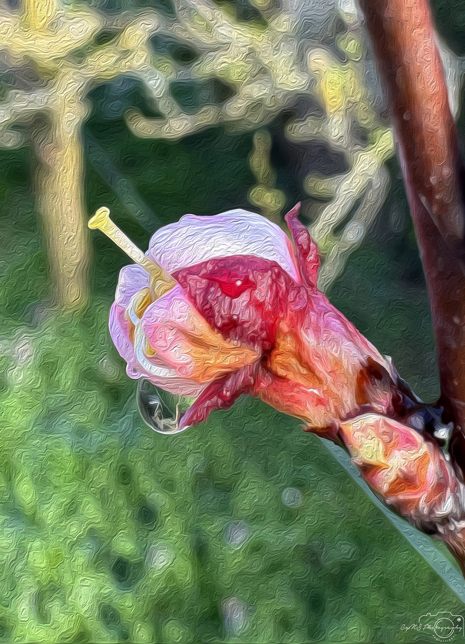 Sur cette photo, une grosse goutte d'eau se pose sur les délicats pétales d'un Prunus triloba . La goutte scintille magnifiquement, sa surface reflétant la plante et ses fleurs éclatantes de manière saisissante. Les douces teintes rose du Prunus triloba sont parfaitement capturées par le reflet, ajoutant une touche d'élégance supplémentaire et rendant la photo véritablement fascinante.