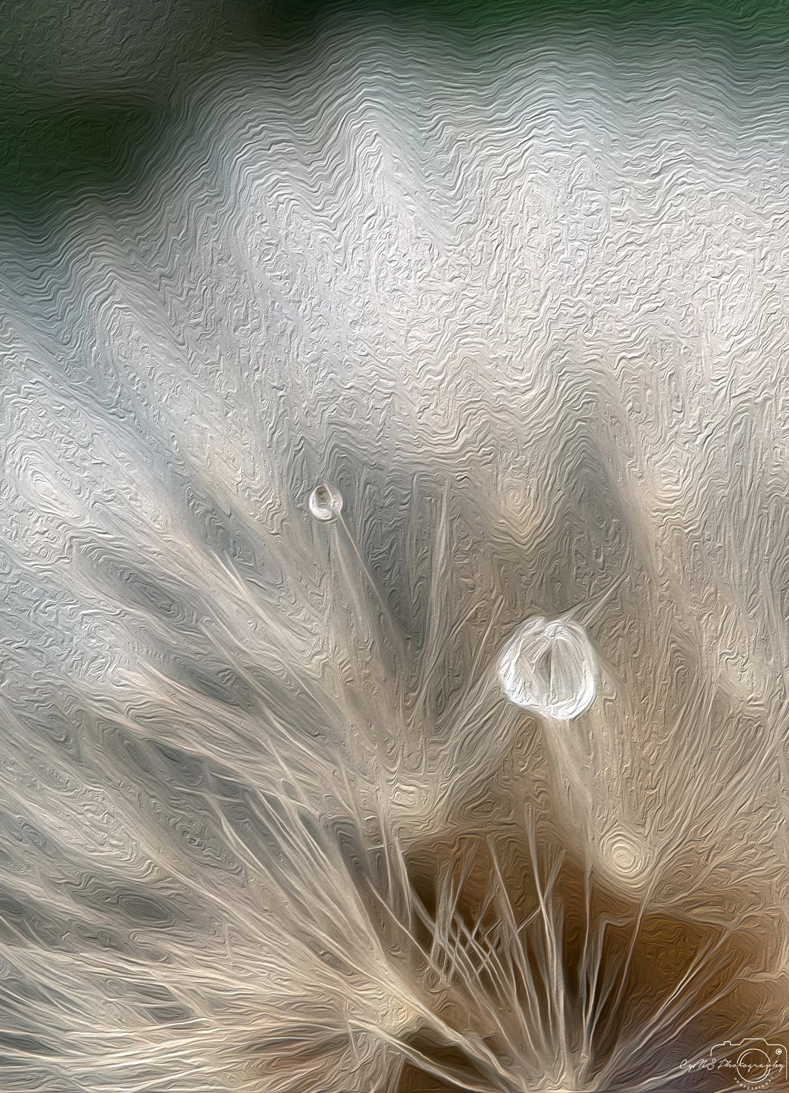 Dans ce gros plan d'un pissenlit, deux gouttes d'eau reposent délicatement parmi ses filaments, l'une beaucoup plus grosse que l'autre. La scène est époustouflante : une fleur d'un blanc immaculé, rayonnant comme une douce lumière. Chaque filament retient les gouttelettes telles des pierres précieuses, captant le scintillement du jour. En elles, le monde se reflète dans une beauté silencieuse et parfaite, magnifié et miniaturisé côte à côte.