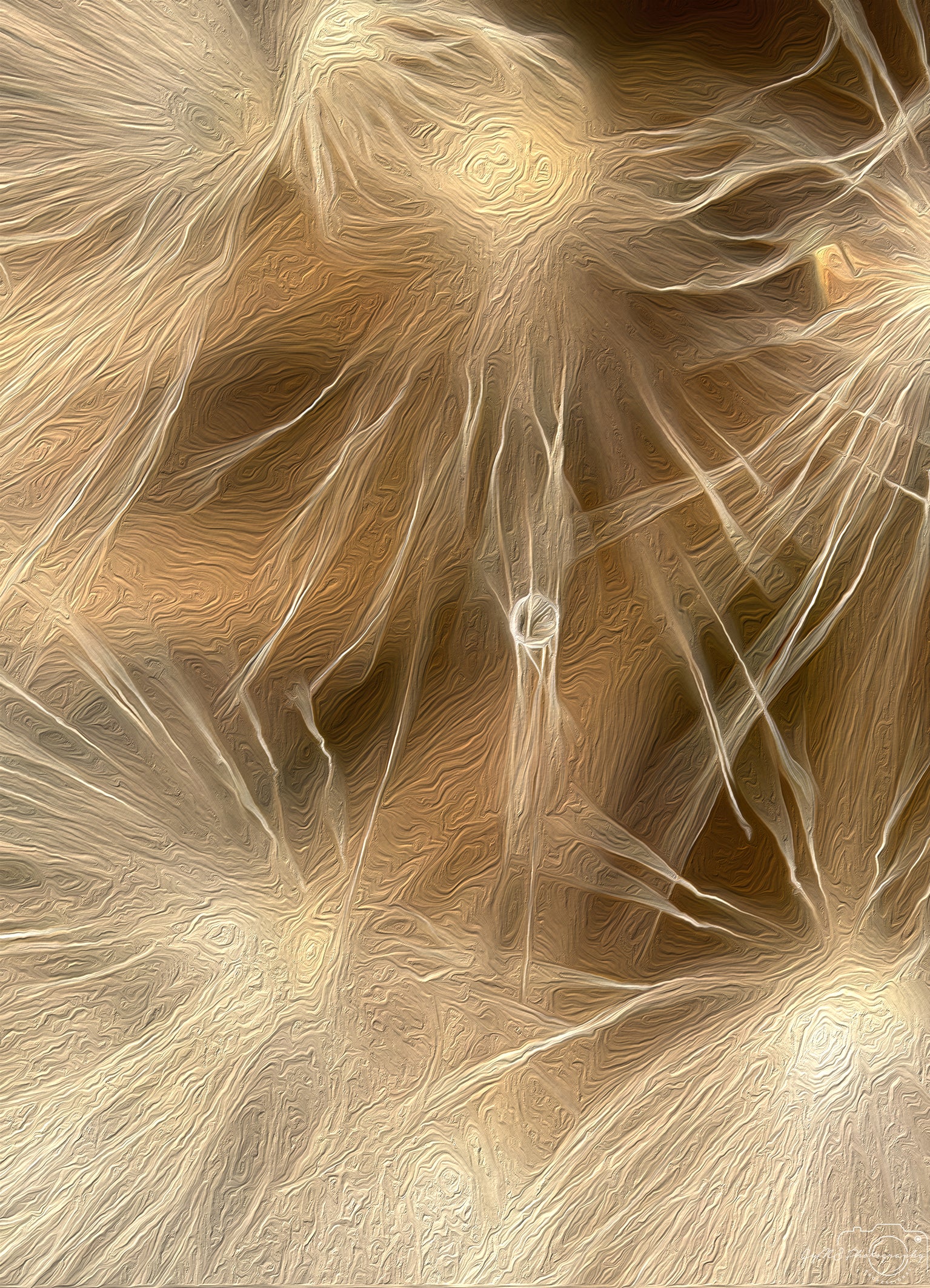 Dans ce gros plan d'un pissenlit, une minuscule goutte d'eau repose délicatement parmi ses brins. La scène est époustouflante : une fleur d'un blanc immaculé, rayonnant comme une douce lumière. Chaque filament capte les reflets du jour, enveloppant la gouttelette comme un joyau. À l'intérieur de cette goutte, le monde se reflète dans une beauté silencieuse et parfaite.