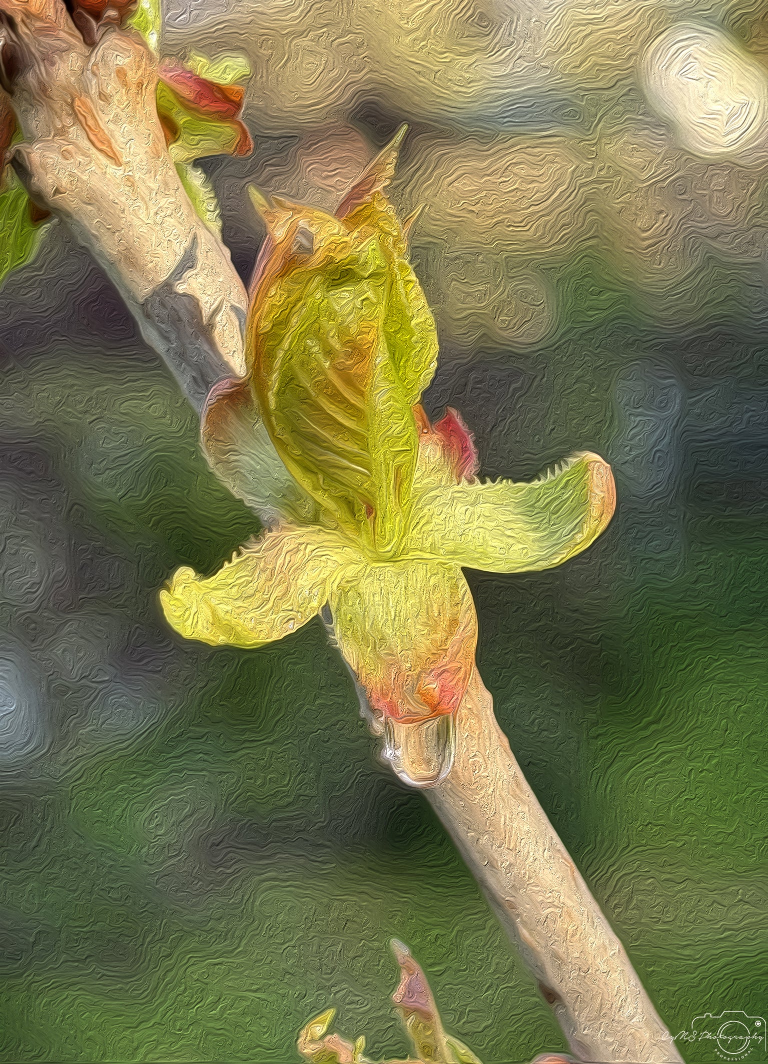 Une goutte d'eau repose délicatement sous la courbe d'une feuille de Prunus avium . Le soleil matinal vient de l'atteindre, projetant une lueur dorée sur le paysage. La goutte, parfaitement ronde et scintillante, semble suspendue dans le temps, prête à tomber. Les deux feuilles qui l'entourent sont grandes ouvertes, presque comme une invitation, leurs bords s'enroulant comme pour nous enlacer. C'est un moment de beauté sereine, tandis que la nature retient son souffle par anticipation.