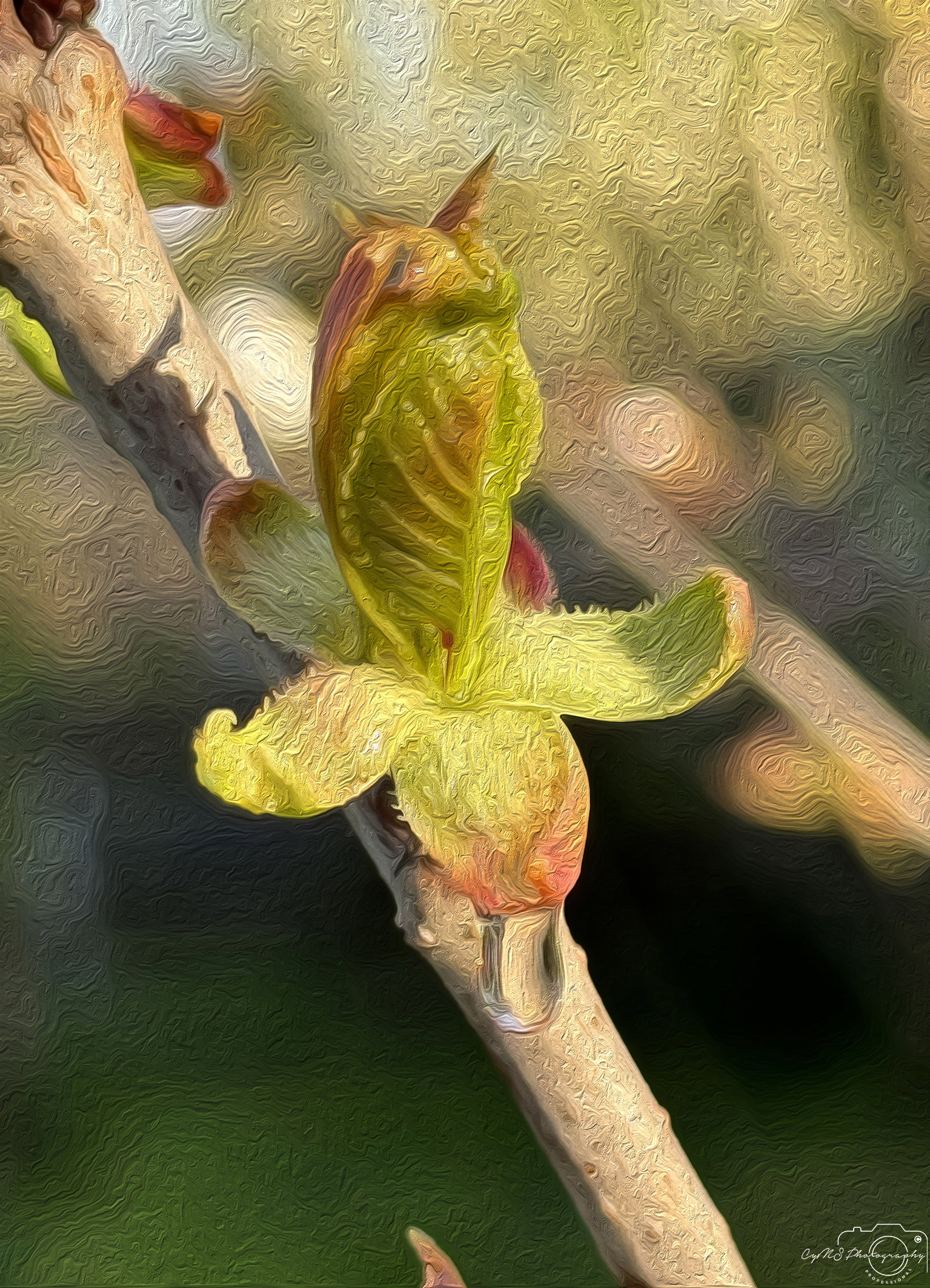 La goutte, désormais lourde de soleil, est sur le point de tomber. Les deux feuilles continuent de s'étendre, leur vert éclatant contrastant parfaitement avec la goutte scintillante qui tremble dangereusement sous elles. Un calme palpable règne dans l'air, et le temps semble s'étirer. Le soleil a pleinement investi le paysage, faisant briller les feuilles d'une douce lumière, tandis que la goutte semble enfin lâcher prise.