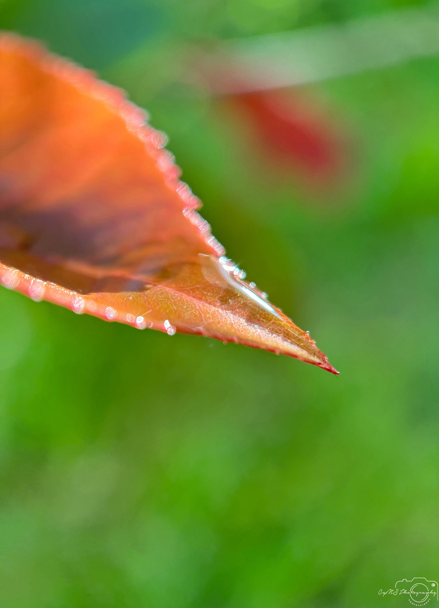 Sur une feuille de Photinia × fraseri se trouve une grande goutte d'eau scintillante, sa surface lisse déformant doucement la teinte orange vive en dessous, comme si elle amplifiait les tons ardents de la feuille tout en faisant écho au calme du jardin environnant dans son reflet vitreux.
