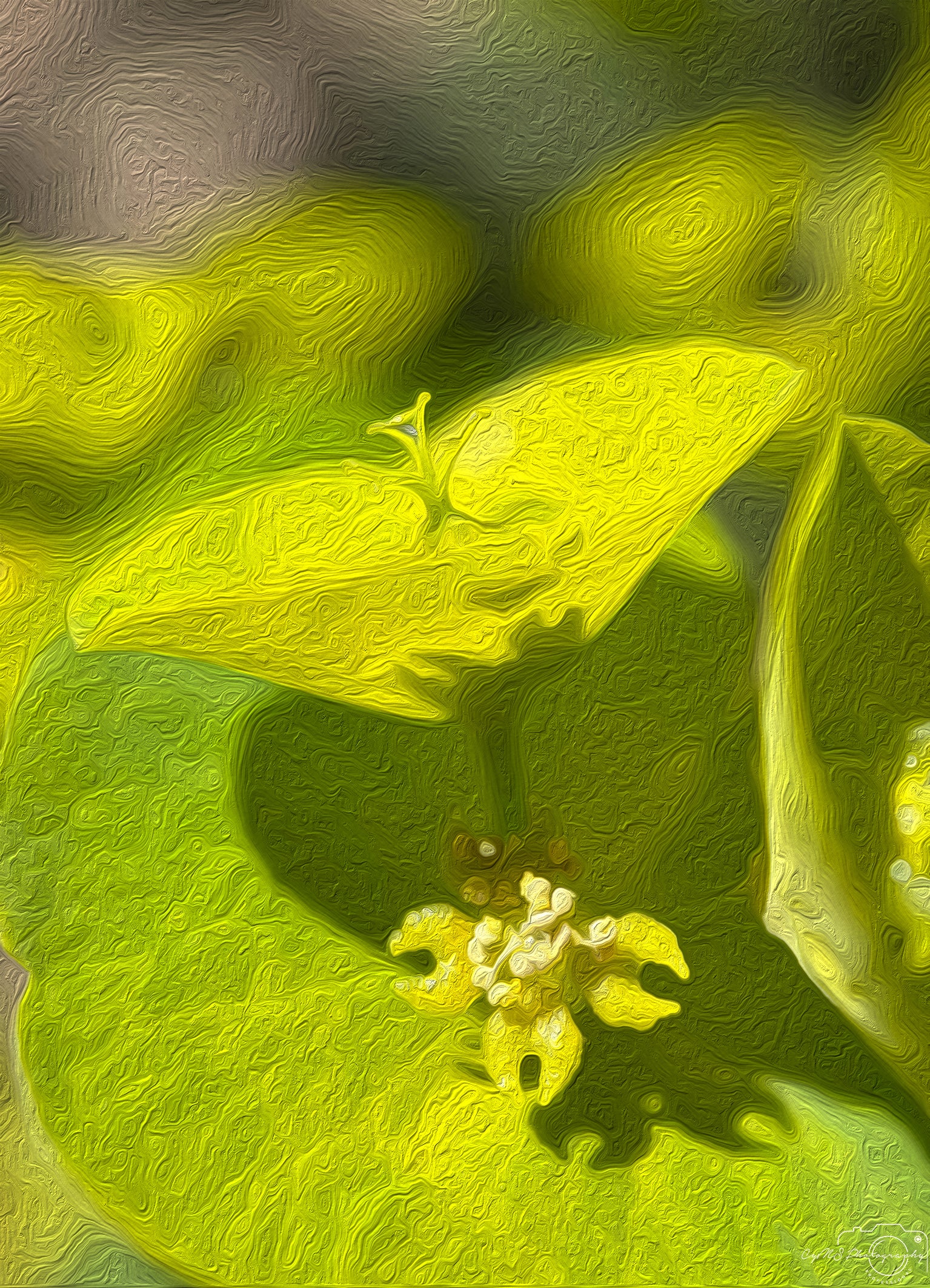 Au cœur d'une fleur d'Euphorbia amygdaloides repose une unique goutte d'eau cristalline, parfaitement immobile. La fleur, entourée de ses feuilles d'un vert éclatant, rayonne d'une intensité tranquille, comme si toute l'essence du printemps était distillée dans cette goutte lumineuse.