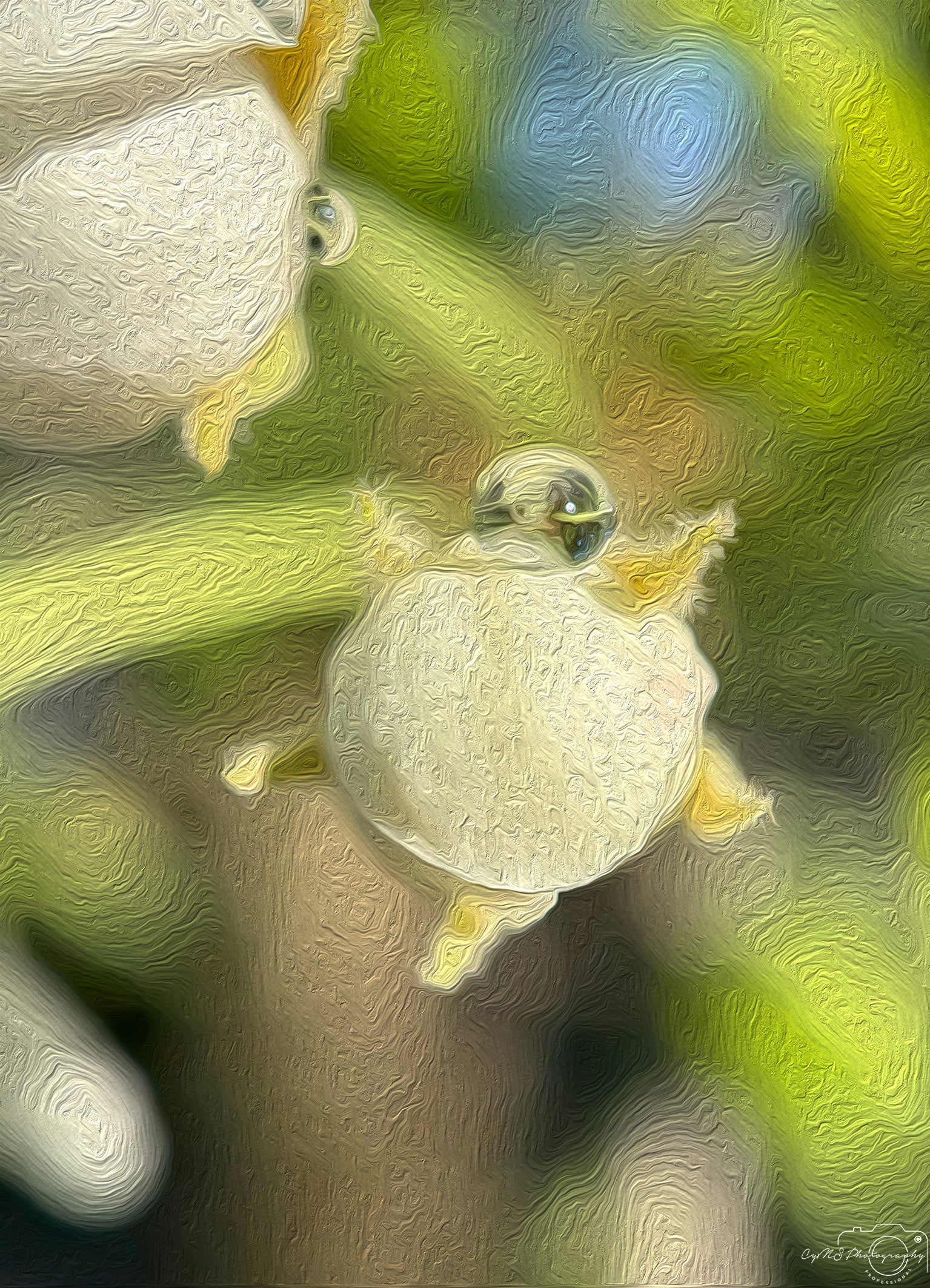 Au sommet de la fleur d'un Pyrus communis , une magnifique goutte d'eau s'accroche délicatement – sa forme rappelle étrangement celle d'un minuscule Gremlin du film. La nature, dans son humeur enjouée, semble avoir sculpté une créature espiègle dans la rosée pure, perchée comme un gardien de la fleur.