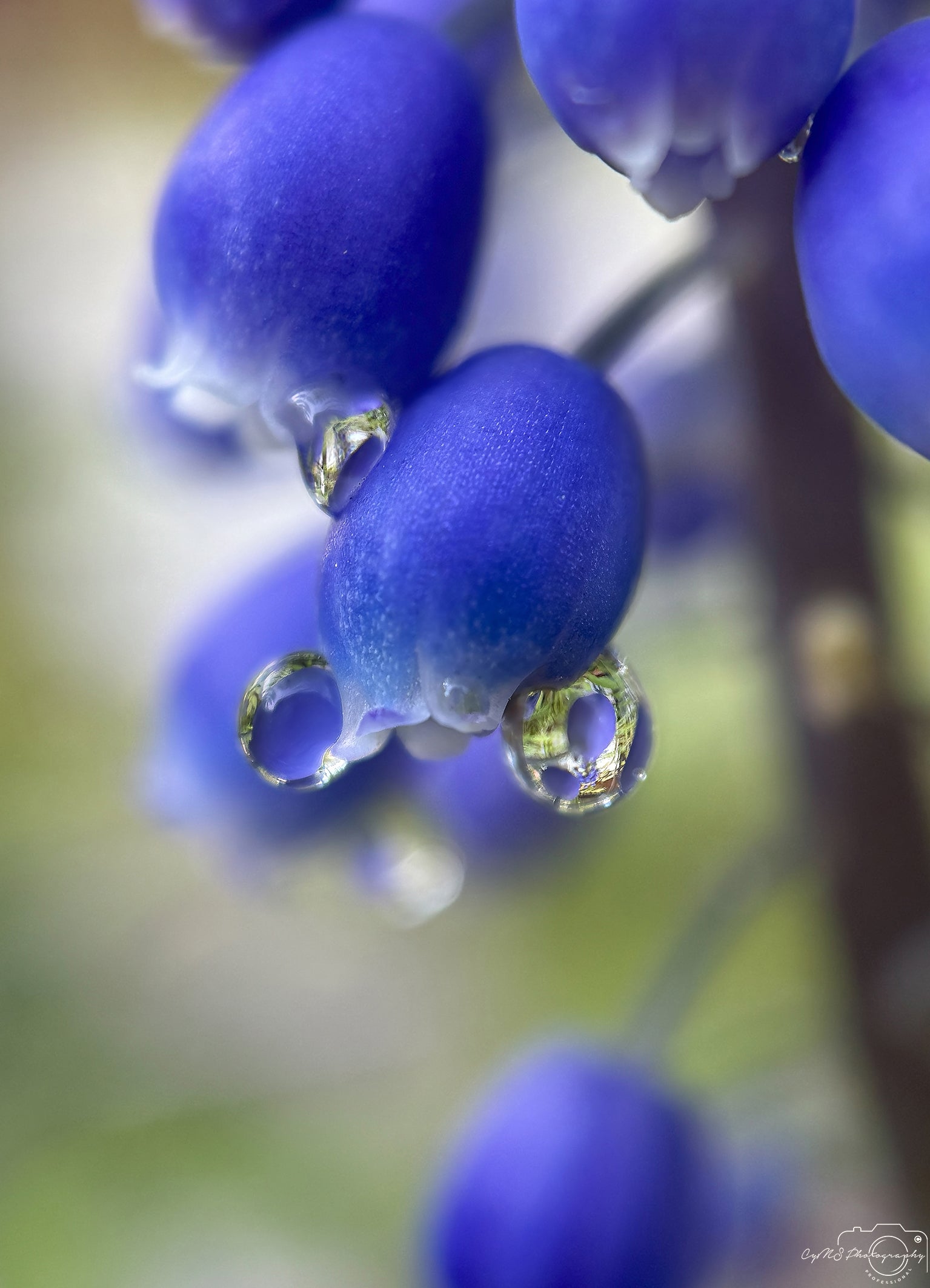 Sur les délicats pétales d'un Muscari armeniacum , des gouttelettes d'eau scintillantes se posent telles de minuscules perles. Le mélange envoûtant de bleu profond et de violet intense dégage un charme surnaturel, comme si la nature elle-même avait orné la fleur des trésors de la rosée matinale.