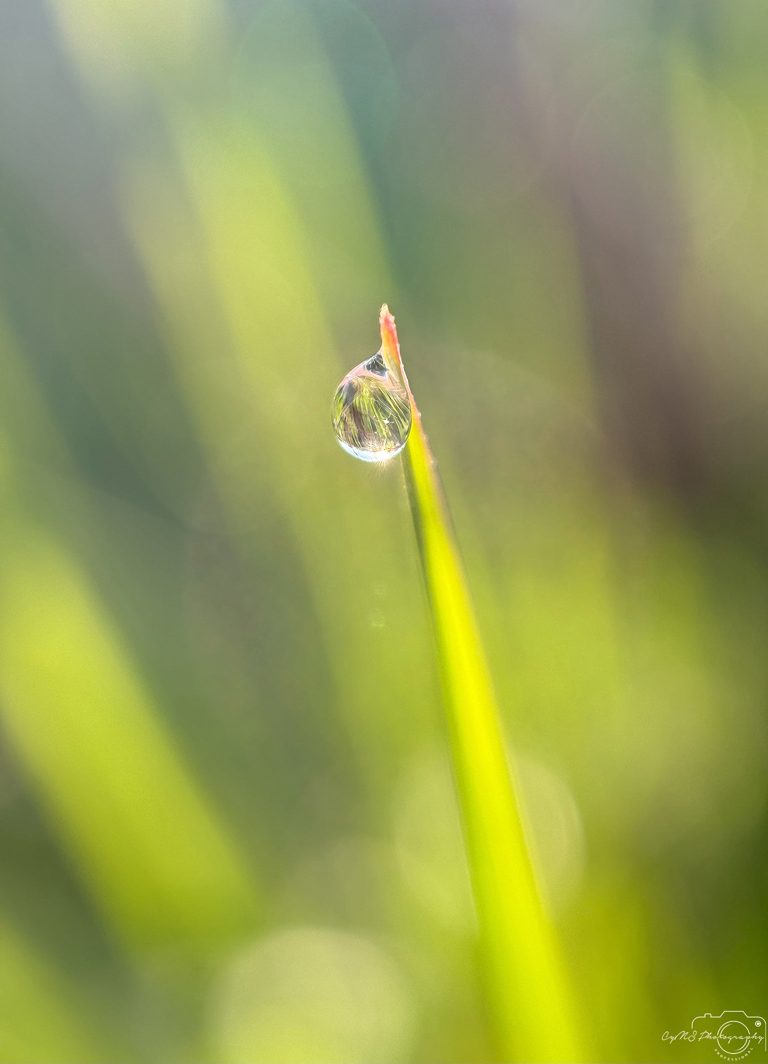 Au petit matin, le soleil commence déjà à briller doucement sur l'herbe, projetant une douce lumière dorée sur le paysage. Une étonnante goutte d'eau repose immobile sur les brins, sa surface parfaitement lisse reflétant le monde qui l'entoure. L'herbe environnante est d'un vert vif, comme la couleur fraîche et croquante d'une pomme Granny Smith, créant une atmosphère vibrante et sereine, où la nature semble s'arrêter pour admirer la lueur matinale.
