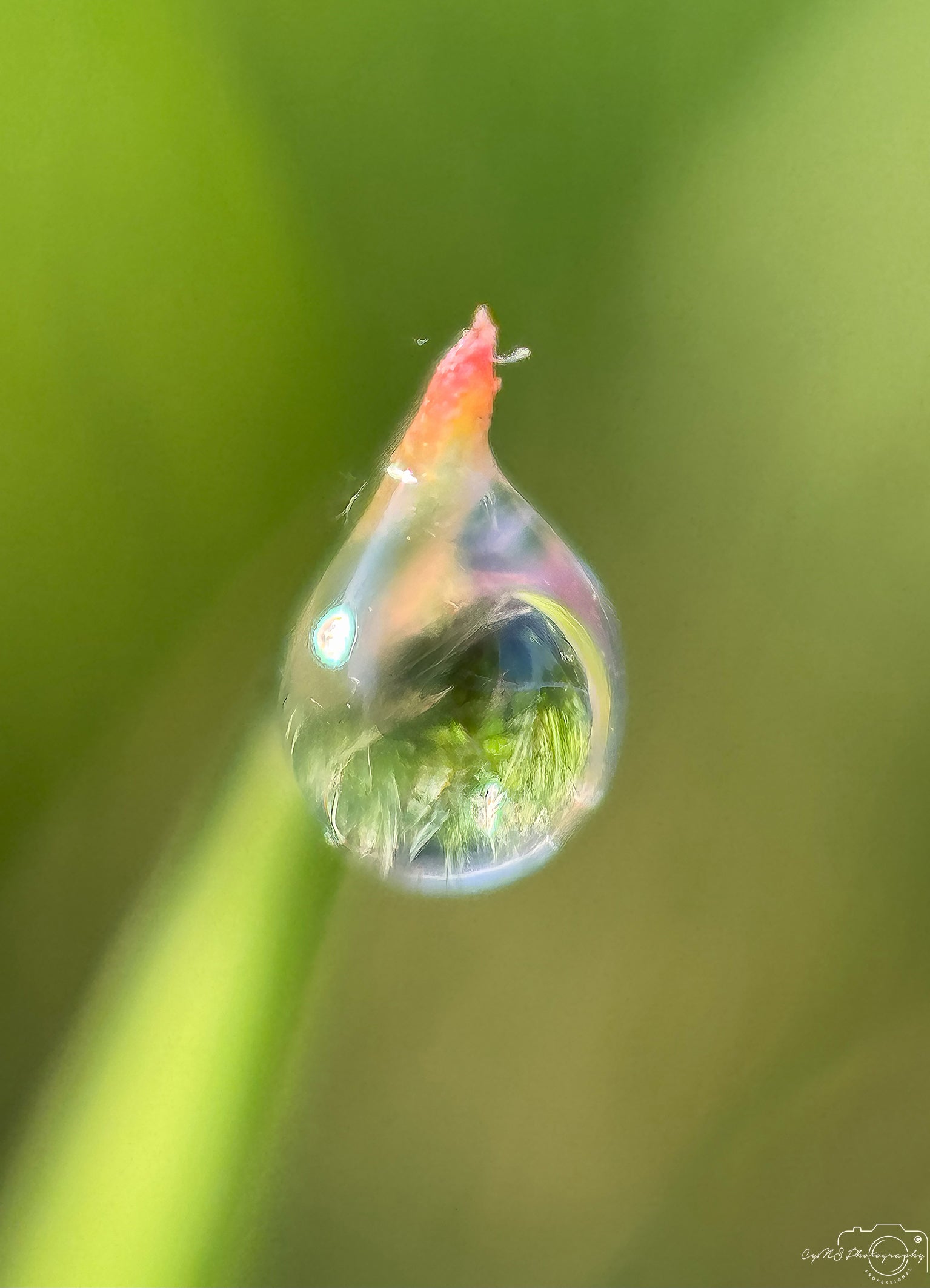 Au petit matin, le soleil commence déjà à briller doucement sur l'herbe, projetant une douce lumière dorée sur le paysage. Une étonnante goutte d'eau repose immobile sur les brins, sa surface parfaitement lisse reflétant le monde qui l'entoure. L'herbe environnante est d'un vert vif, comme la couleur fraîche et croquante d'une pomme Granny Smith, créant une atmosphère vibrante et sereine, où la nature semble s'arrêter pour admirer la lueur matinale.