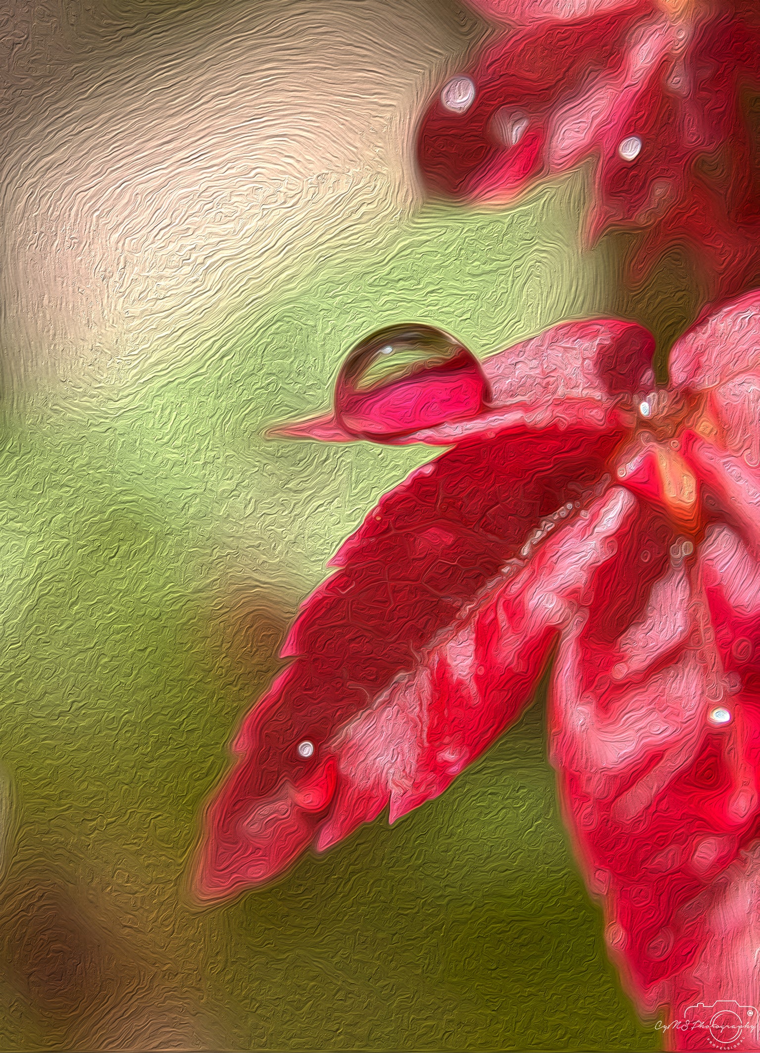 Une goutte d'eau repose sur la feuille d'un Acer palmatum . Parfaitement transparente, elle reflète les teintes rougeâtres vibrantes de la feuille et du monde qui l'entoure. La goutte repose silencieusement, capturant la beauté de son environnement dans un calme délicat, tandis que les couleurs vibrantes de la feuille ondulent et dansent dans son reflet.