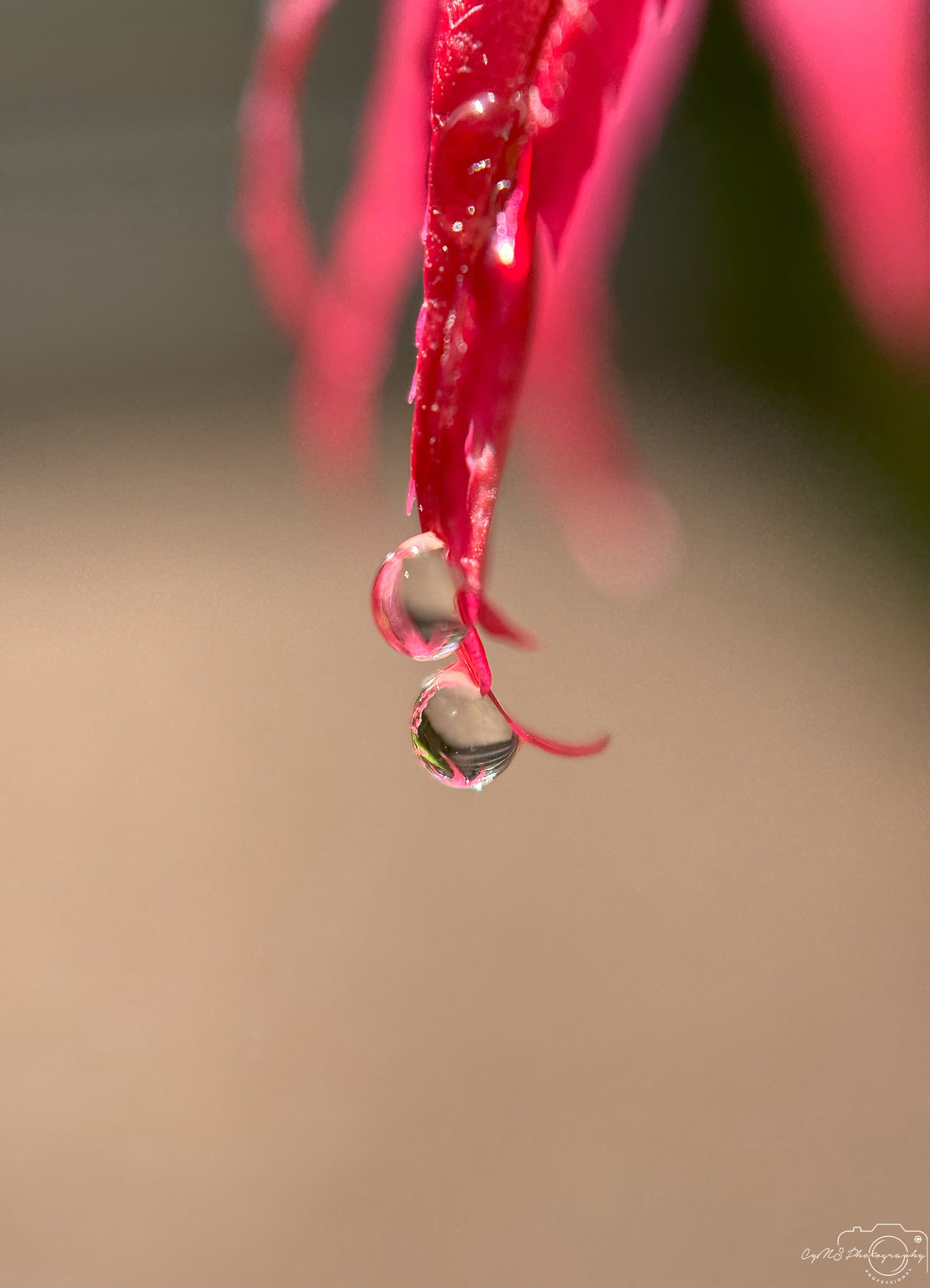 Deux gouttes d'eau reposent côte à côte sur la même feuille d' Acer palmatum . Chaque goutte est parfaitement transparente, reflétant les teintes rougeâtres vibrantes de la feuille ainsi que le monde qui l'entoure. Les gouttes s'assemblent, capturant la beauté de leur environnement dans une délicate symétrie, tandis que les couleurs vibrantes de la feuille ondulent et dansent dans leurs reflets.
