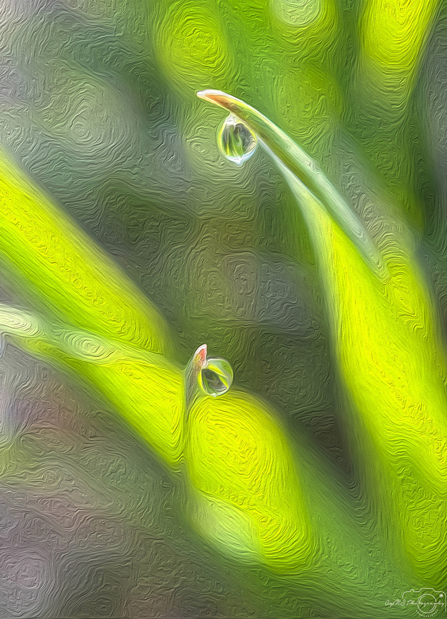 Au petit matin, le soleil commence déjà à briller doucement sur l'herbe, projetant une douce lumière dorée sur le paysage. Deux magnifiques gouttes d'eau reposent immobiles sur les brins, leurs surfaces parfaitement lisses et claires, reflétant le monde qui les entoure. L'herbe environnante est d'un vert vif, comme la couleur fraîche et croquante d'une pomme Granny Smith, créant une atmosphère vibrante et sereine, où la nature semble s'arrêter pour admirer la lueur matinale.