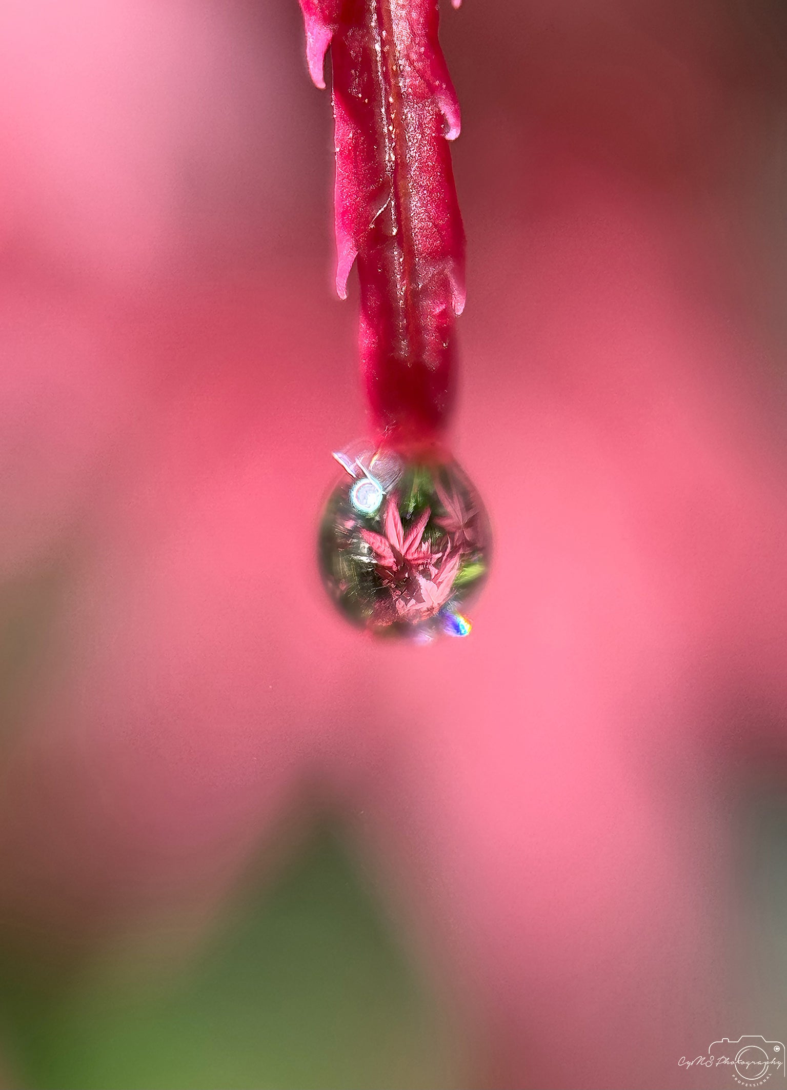 Une goutte d'eau repose sur la feuille d'un Acer palmatum . Parfaitement sphérique et cristalline, elle reflète le rouge vif de la feuille avec une précision irréprochable. Immobile et sereine, elle capture la beauté environnante avec une précision parfaite, tandis que les teintes vibrantes de la feuille ondulent et dansent sur sa surface miroitante.