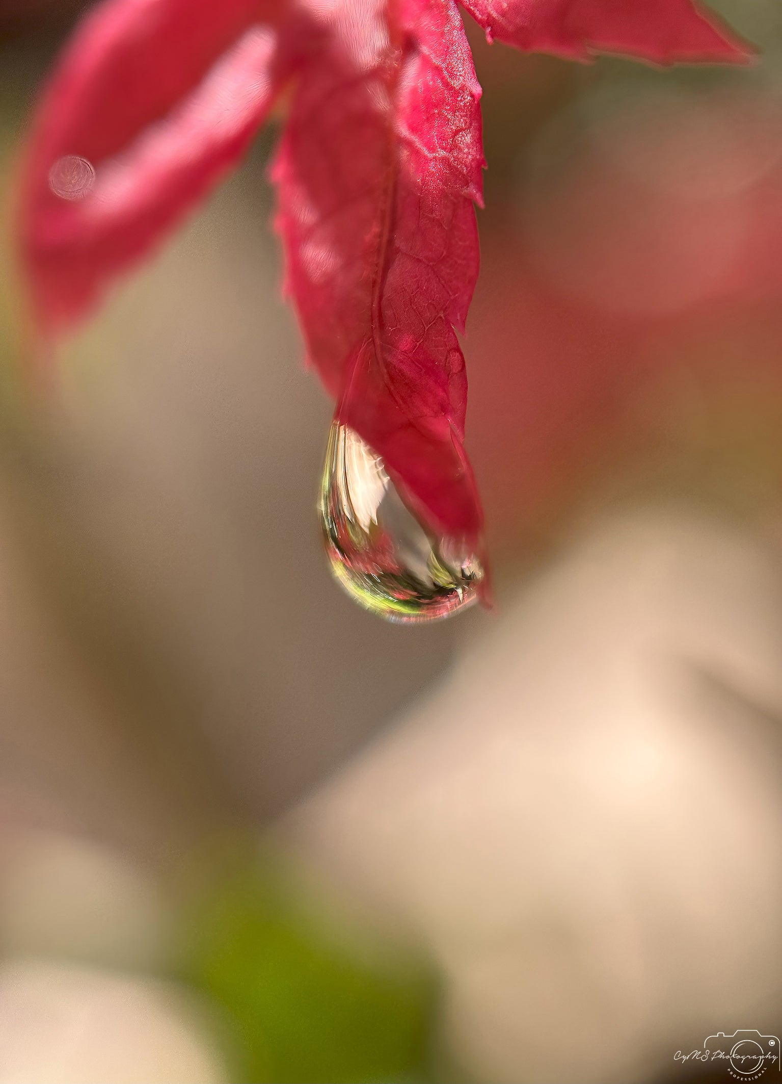 Une goutte d'eau repose sur la feuille d'un Acer palmatum . Parfaitement transparente, elle reflète les teintes rougeâtres vibrantes de la feuille et du monde qui l'entoure. La goutte repose silencieusement, capturant la beauté de son environnement dans un calme délicat, tandis que les couleurs vibrantes de la feuille ondulent et dansent dans son reflet.