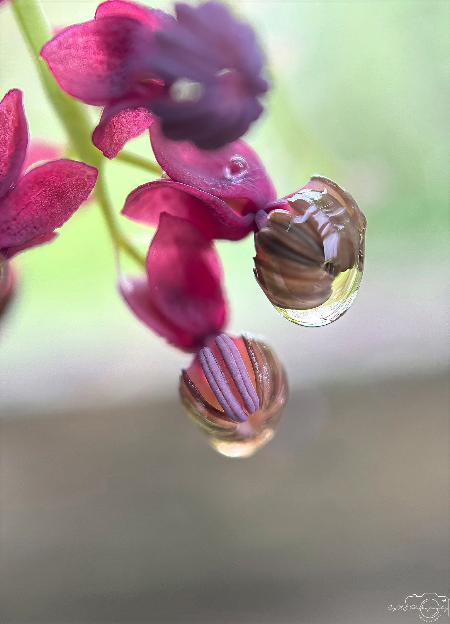 Une goutte d'eau se pose délicatement sur le pétale de l'Akebia quinata . La douce fleur violette l'enveloppe comme un joyau, parfaitement immobile et équilibrée. Sa surface reflète le monde environnant avec des détails délicats, capturant un instant de calme fugace. Les fines vrilles de la vigne s'enroulent à proximité, mais rien ne vient troubler la goutte, maintenue en harmonie par la gracieuse fleur.