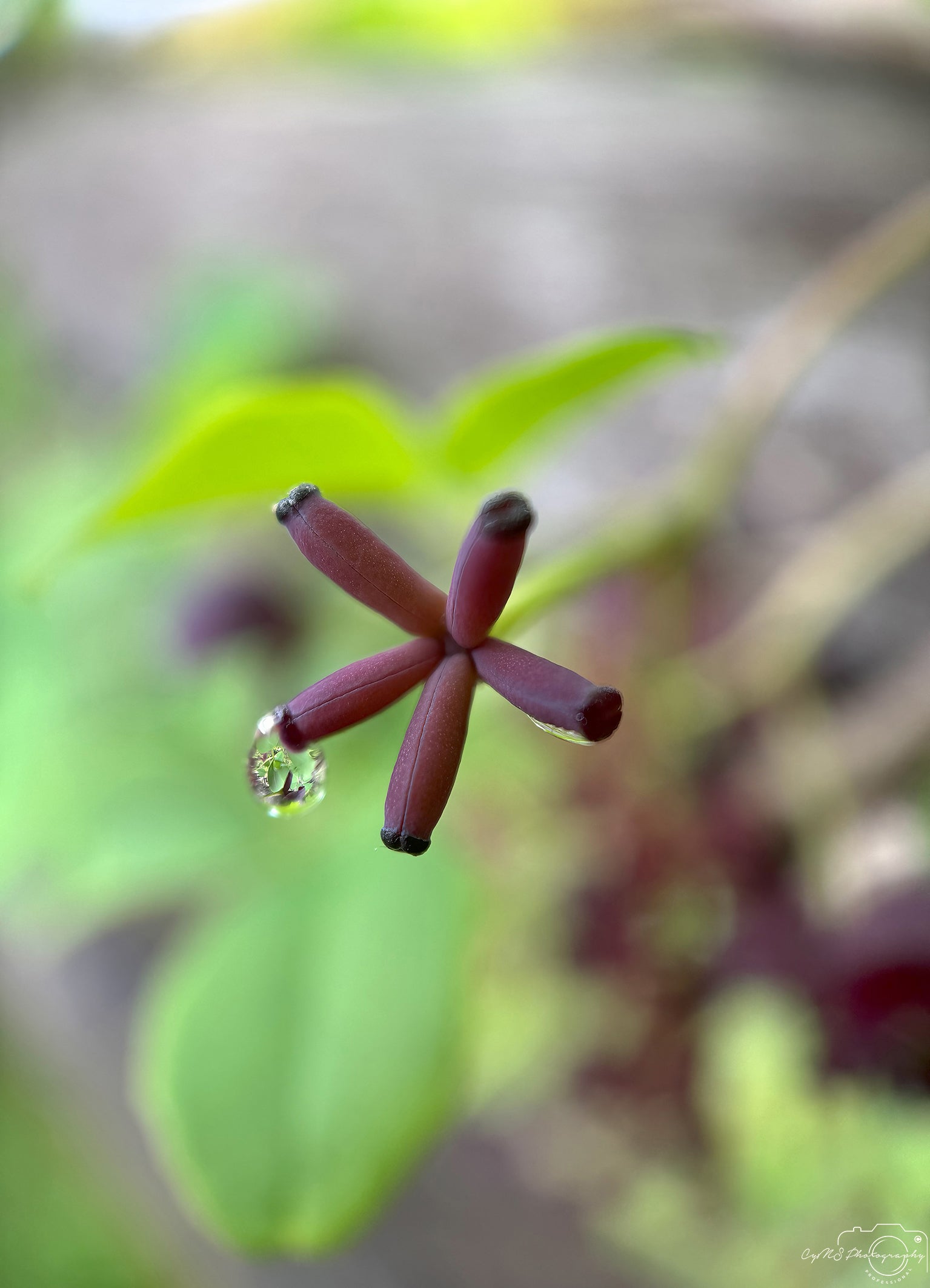 Une goutte d'eau se pose délicatement sur le pétale de l'Akebia quinata . La douce fleur violette l'enveloppe comme un joyau, parfaitement immobile et équilibrée. Sa surface reflète le monde environnant avec des détails délicats, capturant un instant de calme fugace. Les fines vrilles de la vigne s'enroulent à proximité, mais rien ne vient troubler la goutte, maintenue en harmonie par la gracieuse fleur.
