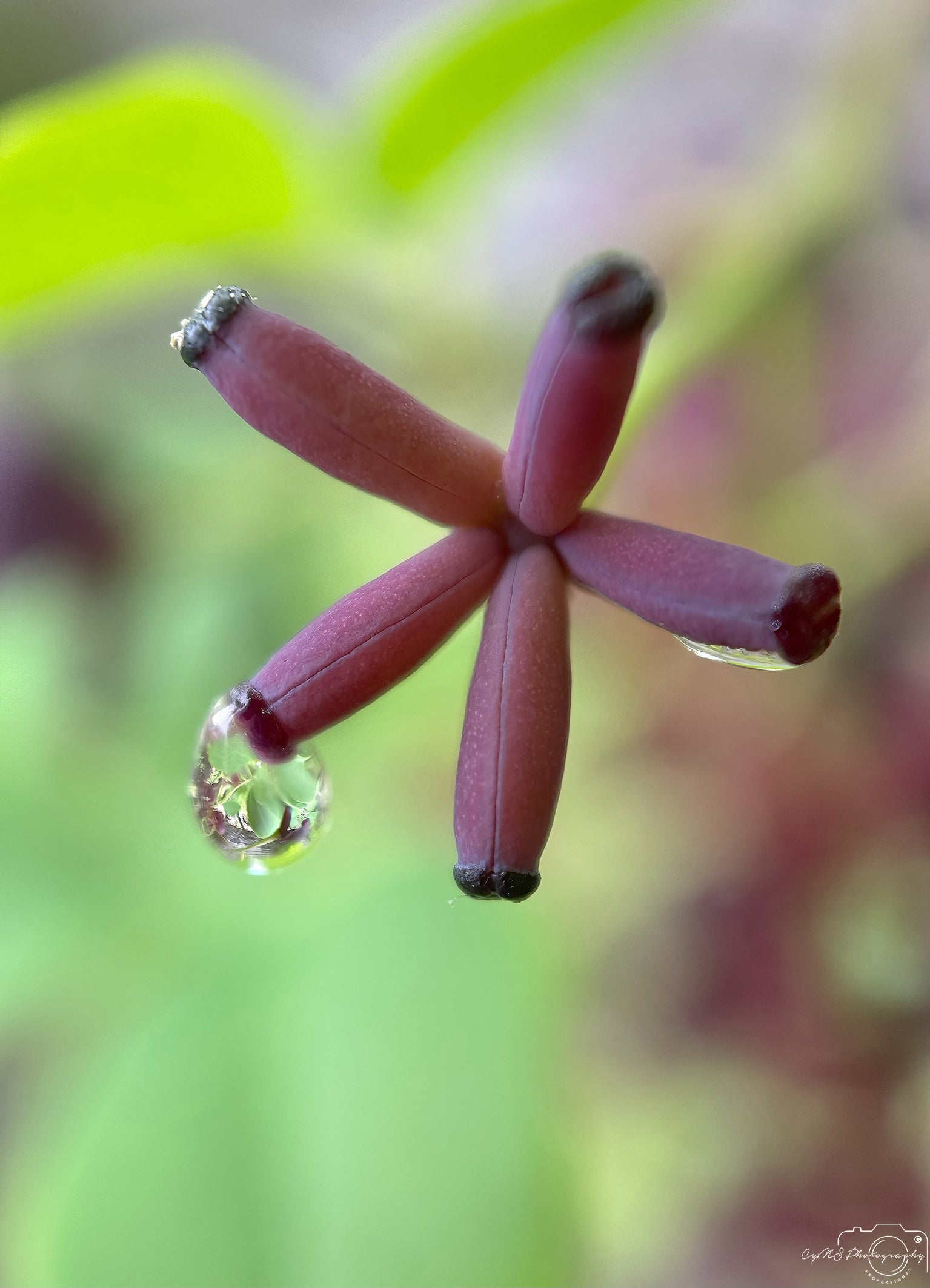 Une goutte d'eau se pose délicatement sur le pétale de l'Akebia quinata . La douce fleur violette l'enveloppe comme un joyau, parfaitement immobile et équilibrée. Sa surface reflète le monde environnant avec des détails délicats, capturant un instant de calme fugace. Les fines vrilles de la vigne s'enroulent à proximité, mais rien ne vient troubler la goutte, maintenue en harmonie par la gracieuse fleur.