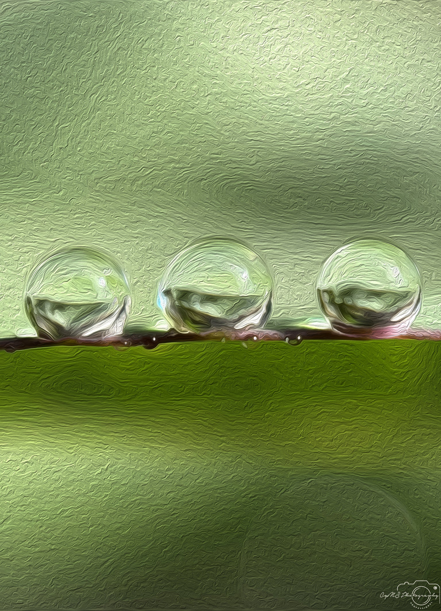 Le long d'une fine brindille, de nombreuses gouttelettes se succèdent, chacune captant la lumière à sa manière. Les couleurs qui les entourent sont vives : des verts et des bruns doux se fondent dans une harmonie vibrante. Les gouttelettes, parfaitement rondes, reflètent la scène telles de minuscules perles de verre, transformant une simple brindille en un objet d'une beauté discrète.