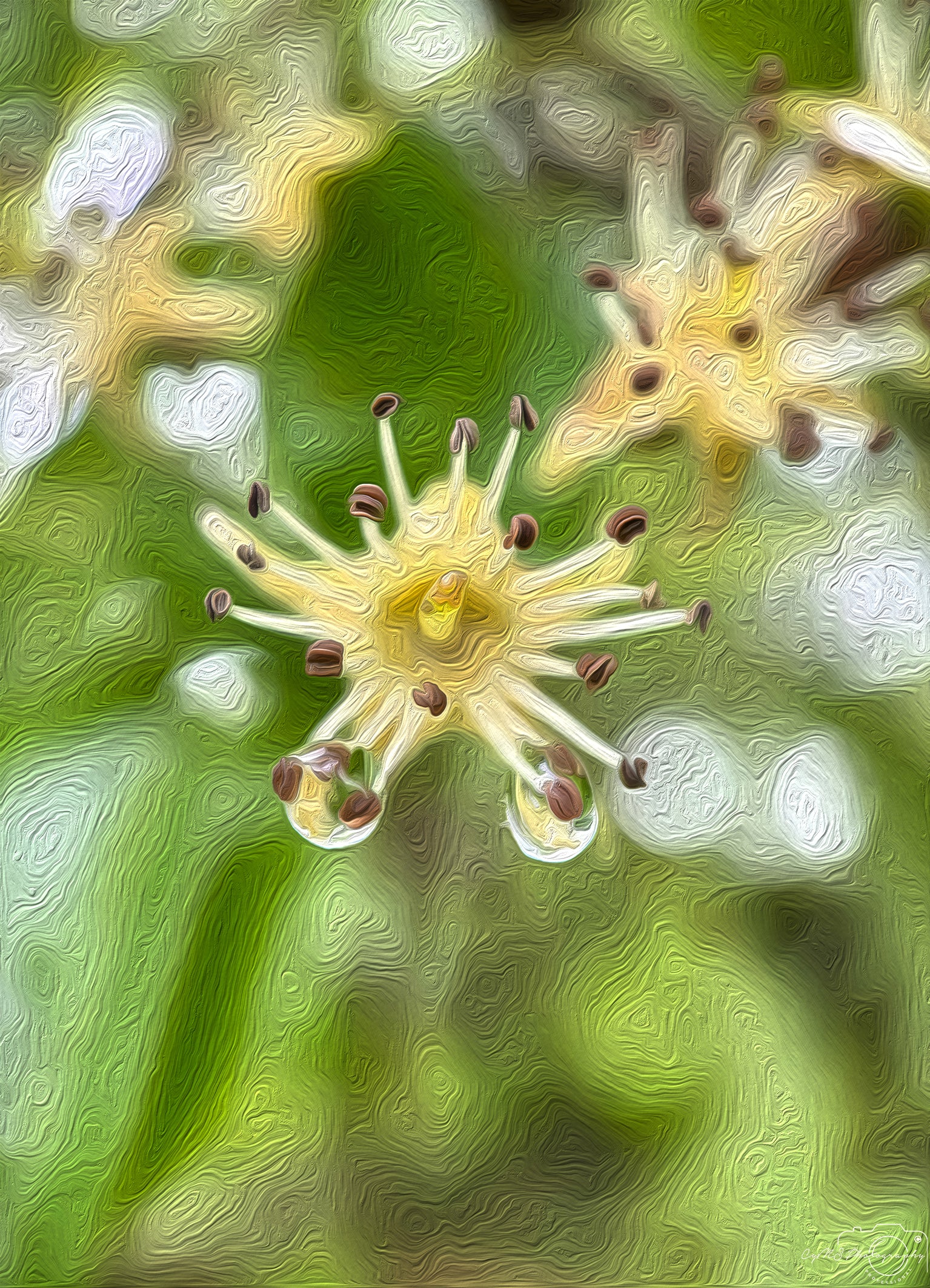 Sur les pistils d'une fleur de Pyrus communis reposent d'étonnantes gouttes d'eau. Légères, elles se posent parmi les filaments pâles, leur présence à la fois délicate et vive. La délicate structure de la fleur rencontre l'éclat silencieux de l'eau, comme si la fleur gardait encore les derniers rayons du soleil.