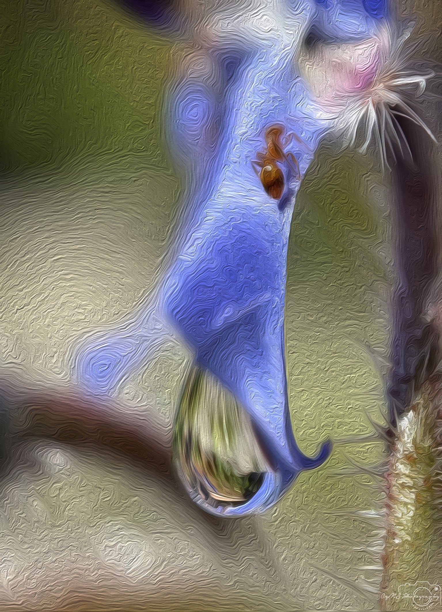 Sur une magnifique Borago officinalis bleutée se trouve une goutte d'eau envoûtante. Posée sur un pétale, elle capte les reflets du ciel et de la lumière, tandis que la teinte profonde de la fleur semble l'enlacer. Une fourmi orangée rampe vers le haut, progressant prudemment vers le centre de la fleur, sa couleur chaude contrastant avec le bleu froid – la vie en mouvement à côté de l'immobilité.