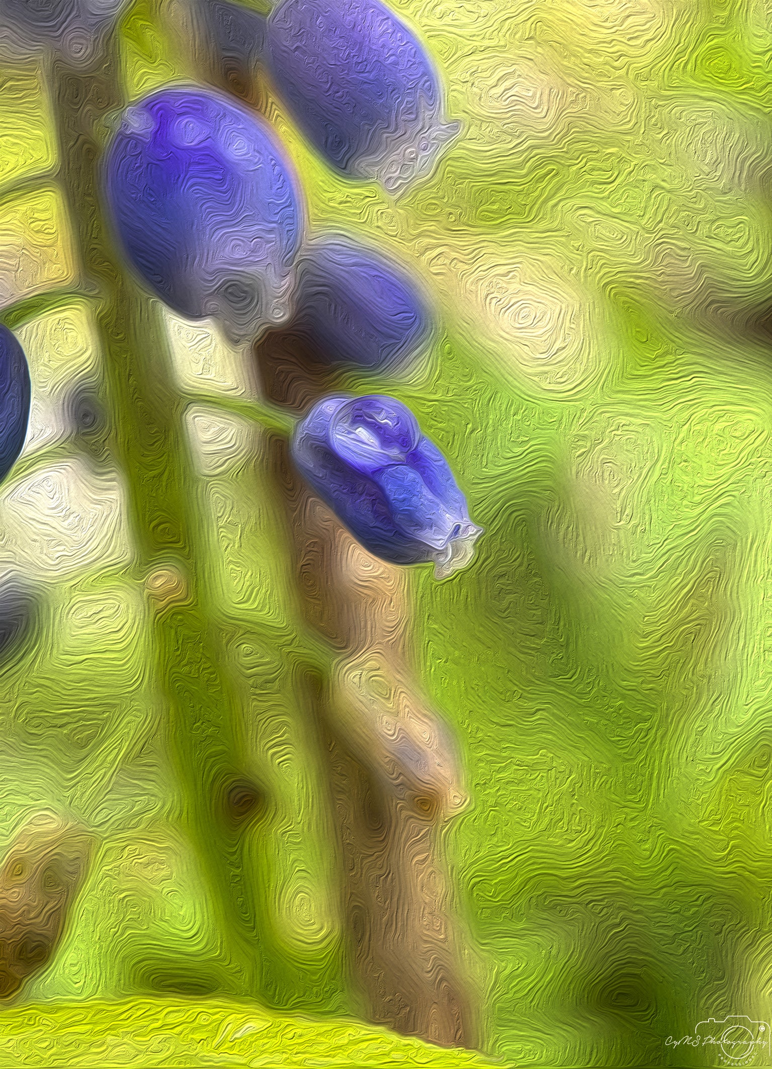 Sur un Muscari armeniacum repose une magnifique goutte d'eau. Elle se pose parmi les fleurs groupées, capturant des reflets lumineux entre des nuances de violet profond et de bleu. Les minuscules fleurs semblent se rassembler autour d'elle, comme si la goutte était un secret gardé au cœur du printemps.