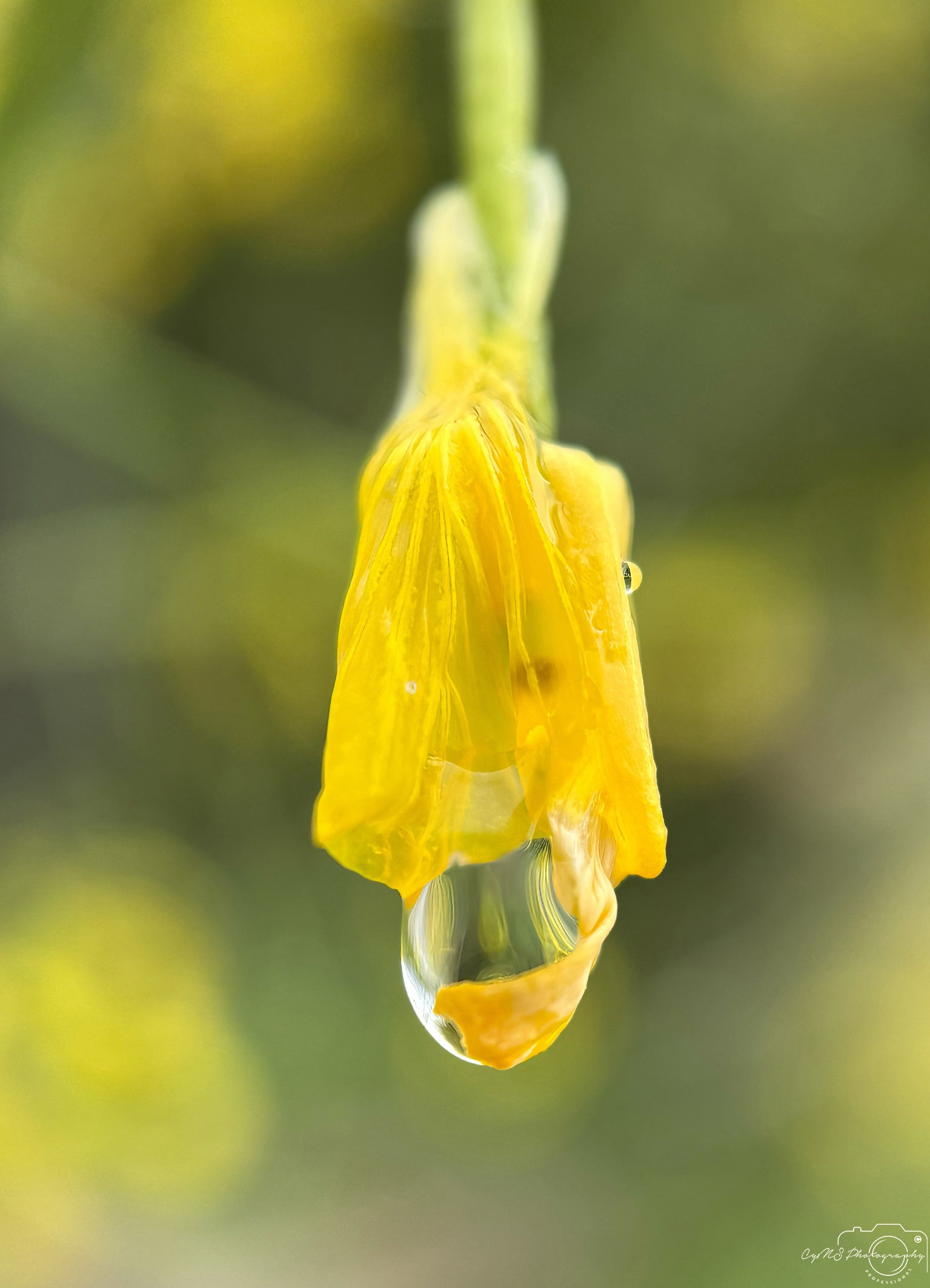 Au sommet d'une fleur jaune vif de Brassica nigra se trouve une jolie goutte d'eau. Elle repose délicatement, sa surface transparente reflétant les pétales environnants, créant un délicat contraste avec le jaune vif. La goutte semble enveloppée d'un doux drap jaune, les pétales se fondant harmonieusement autour d'elle, ajoutant une touche de douceur et de chaleur à ce moment de tranquillité.