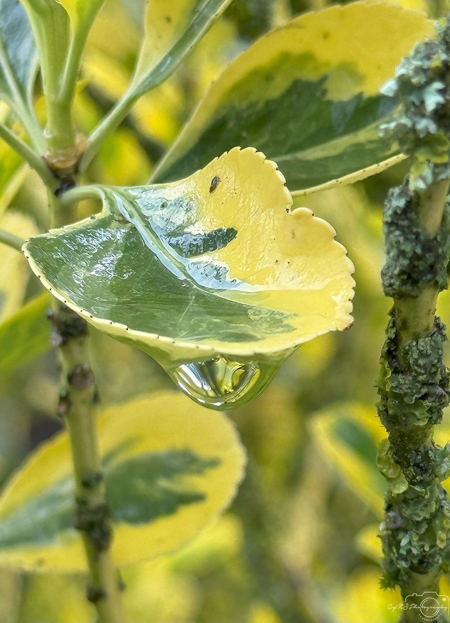 Une goutte d'eau repose délicatement sous la feuille d'un Euonymus japonicus , nichée dans ses plis subtils. La feuille elle-même présente un mélange de vert clair et foncé, avec des touches de jaune qui ajoutent de la profondeur à sa texture. La goutte capte la lumière, créant un contraste chatoyant avec les couleurs vibrantes et variées de la feuille, suspendue dans le délicat équilibre de la nature.