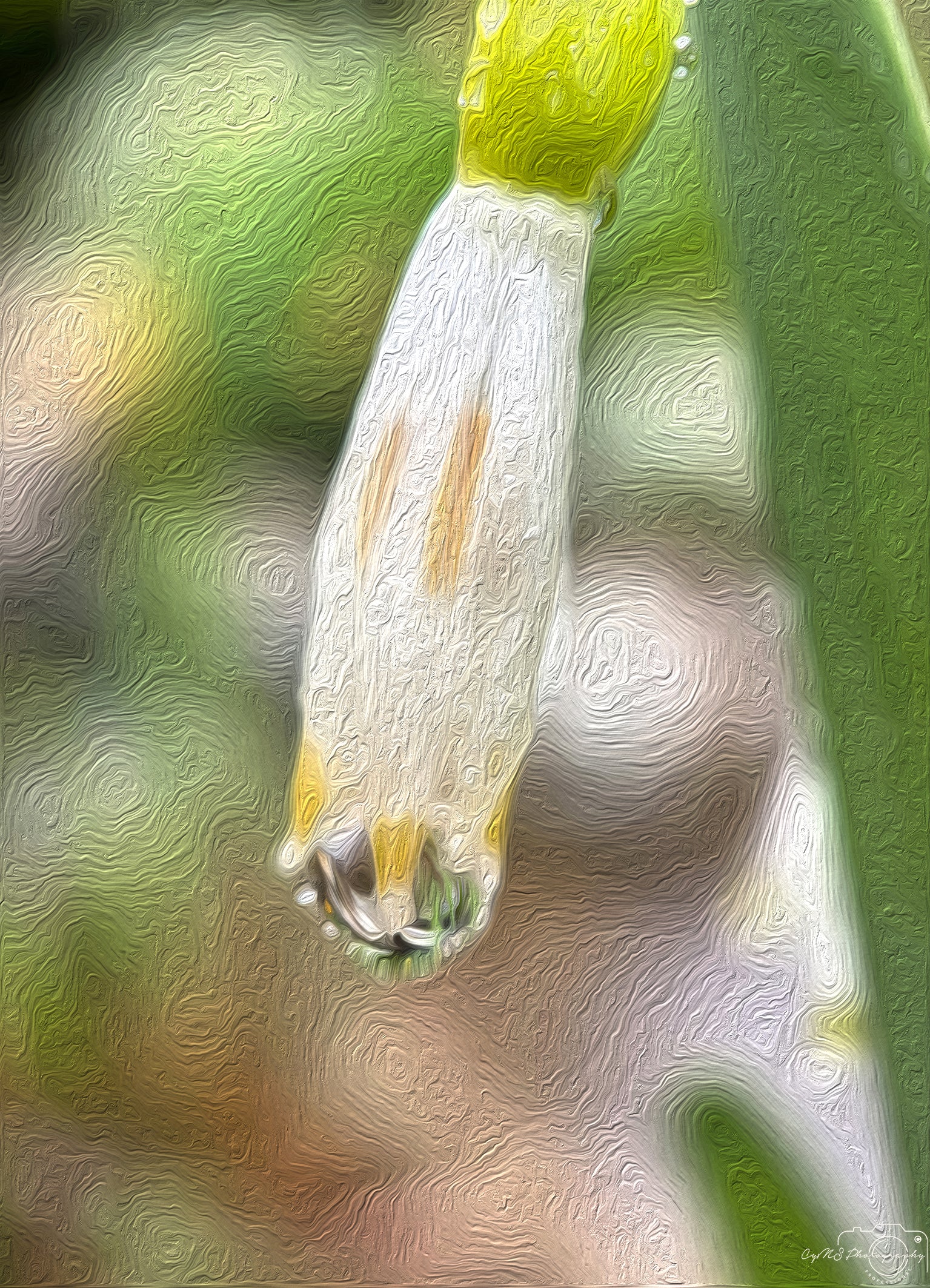 Sur un pétale de Leucojum aestivum se trouve une magnifique goutte d'eau, scintillant dans l'air frais après une pluie récente. Les pétales d'un blanc immaculé forment un décor parfait, leurs courbes douces enlaçant la goutte qui capte la lumière. La fraîcheur de la pluie flotte dans l'air, et la goutte semble contenir l'essence de l'instant : une beauté calme et sereine.