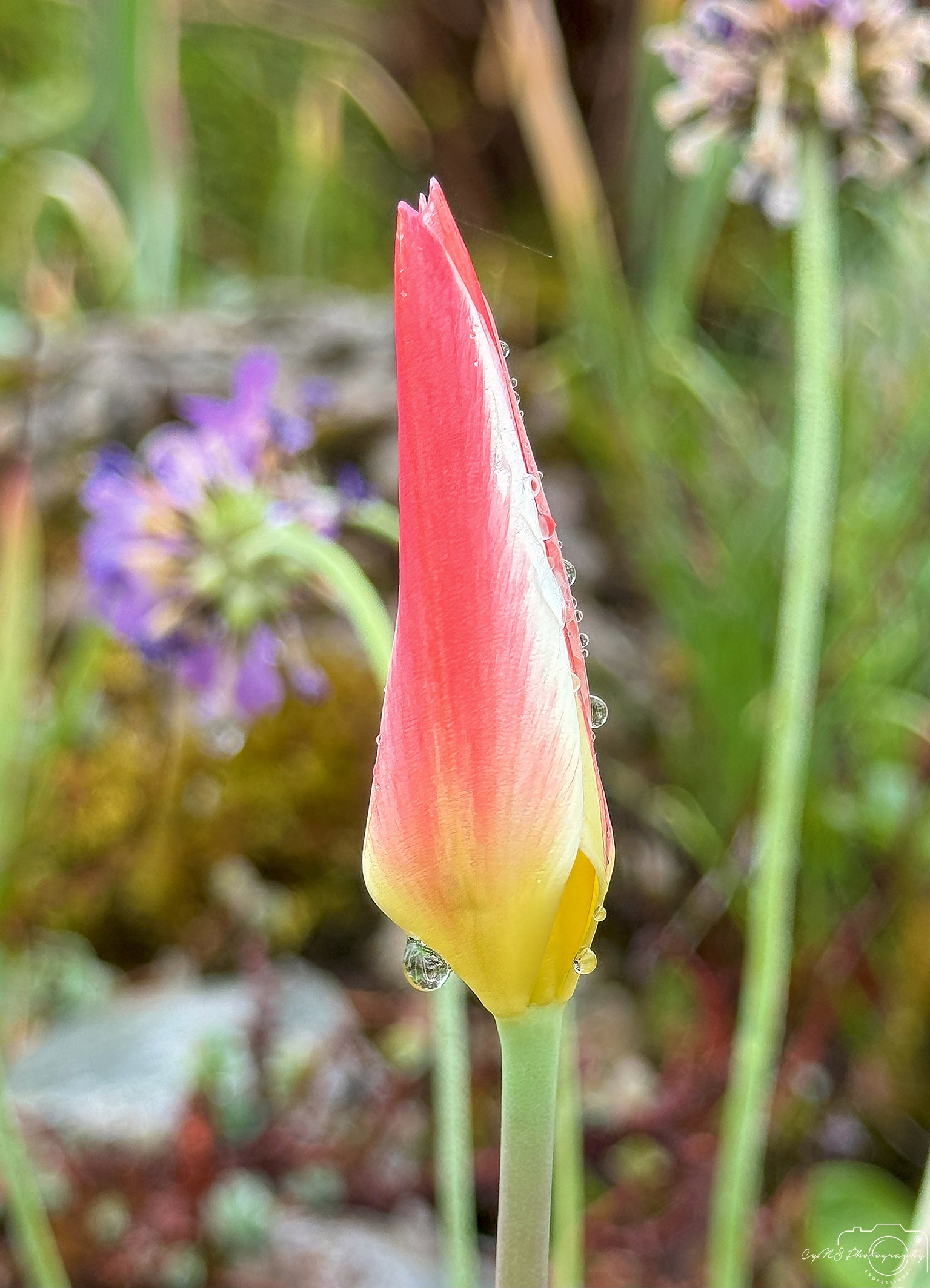 Sur une magnifique Tulipa clusiana reposent de délicates gouttes d'eau, probablement tombées récemment, témoignant des récentes pluies torrentielles. Les couleurs vives de la fleur, avec leurs nuances de rose tendre et leurs stries d'orange vif, se détachent des gouttelettes, ajoutant une touche de chaleur à la fraîcheur des pétales trempés. On dirait que la nature elle-même peint un chef-d'œuvre, équilibrant couleurs et calme en parfaite harmonie.
