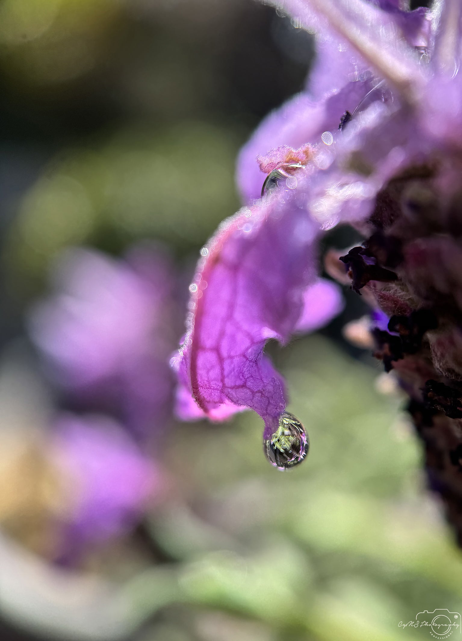 Sur une Lavandula stoechas repose une magnifique goutte d'eau, dont la surface lisse reflète le paysage environnant dans des couleurs éclatantes. La goutte capture les teintes vibrantes de la lavande et de son environnement, créant un monde minuscule et chatoyant. La délicatesse de la fleur et son reflet éclatant s'unissent pour créer un spectacle saisissant de l'art de la nature.