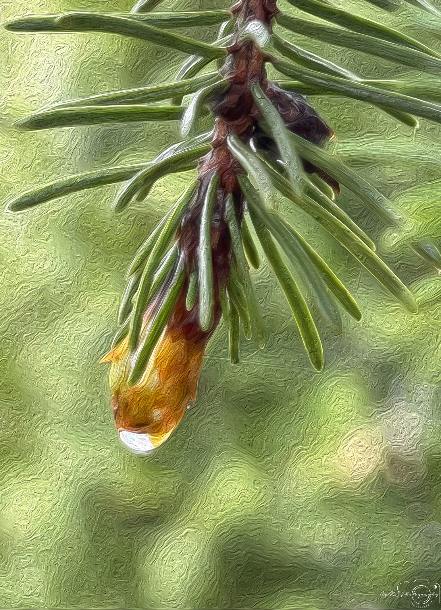 Sur un Picea abies se trouve une magnifique goutte d'eau, posée gracieusement sur l'une de ses branches denses et pointues. Le vert profond de l'épicéa contraste magnifiquement avec la clarté de la goutte, qui capte la lumière dans un bref instant chatoyant, capturant l'essence du calme et l'élégance tranquille de la nature.